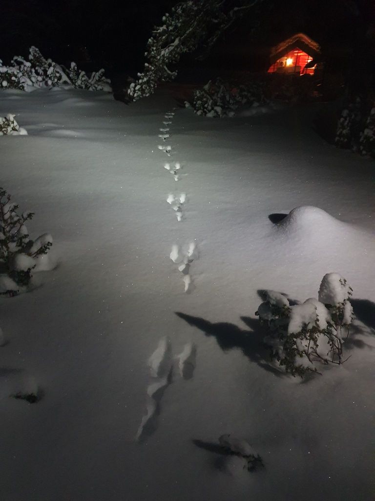 Den siste lille bakken ned til parkeringsplassen ramler Elvin. «Ååååh, hvorfor er det så mange store hull i løypa?!» Det er fotspor det Elvin…