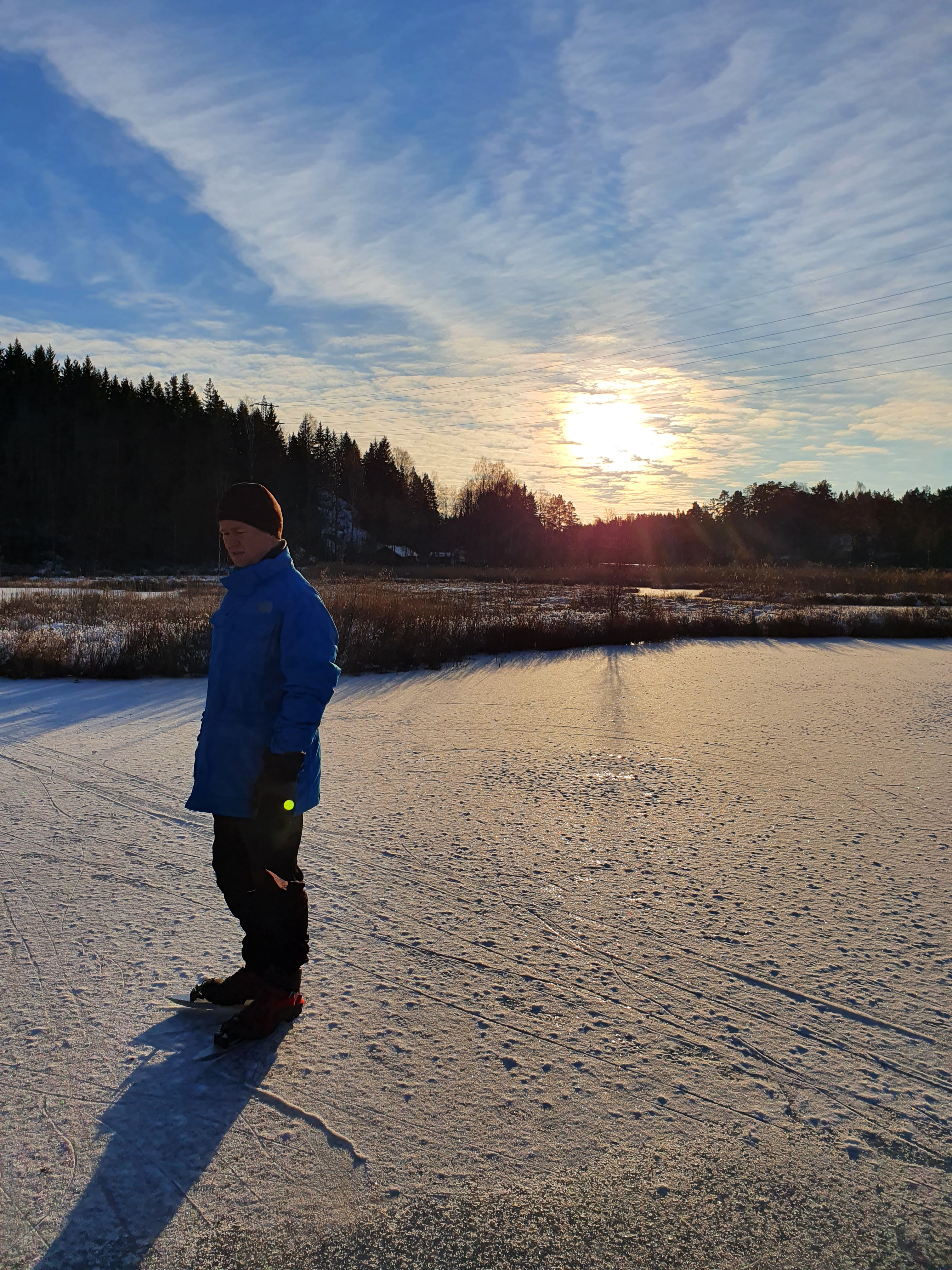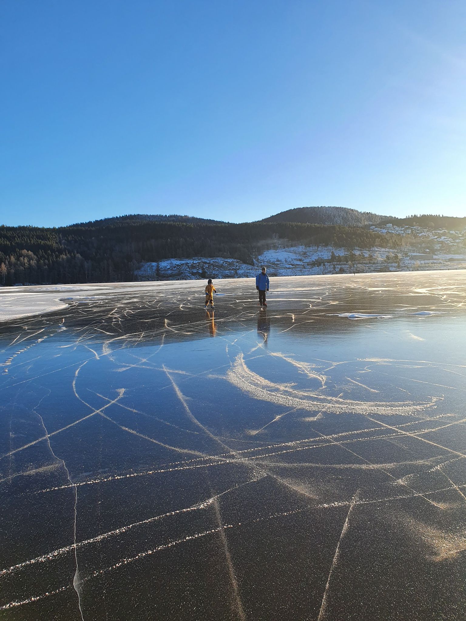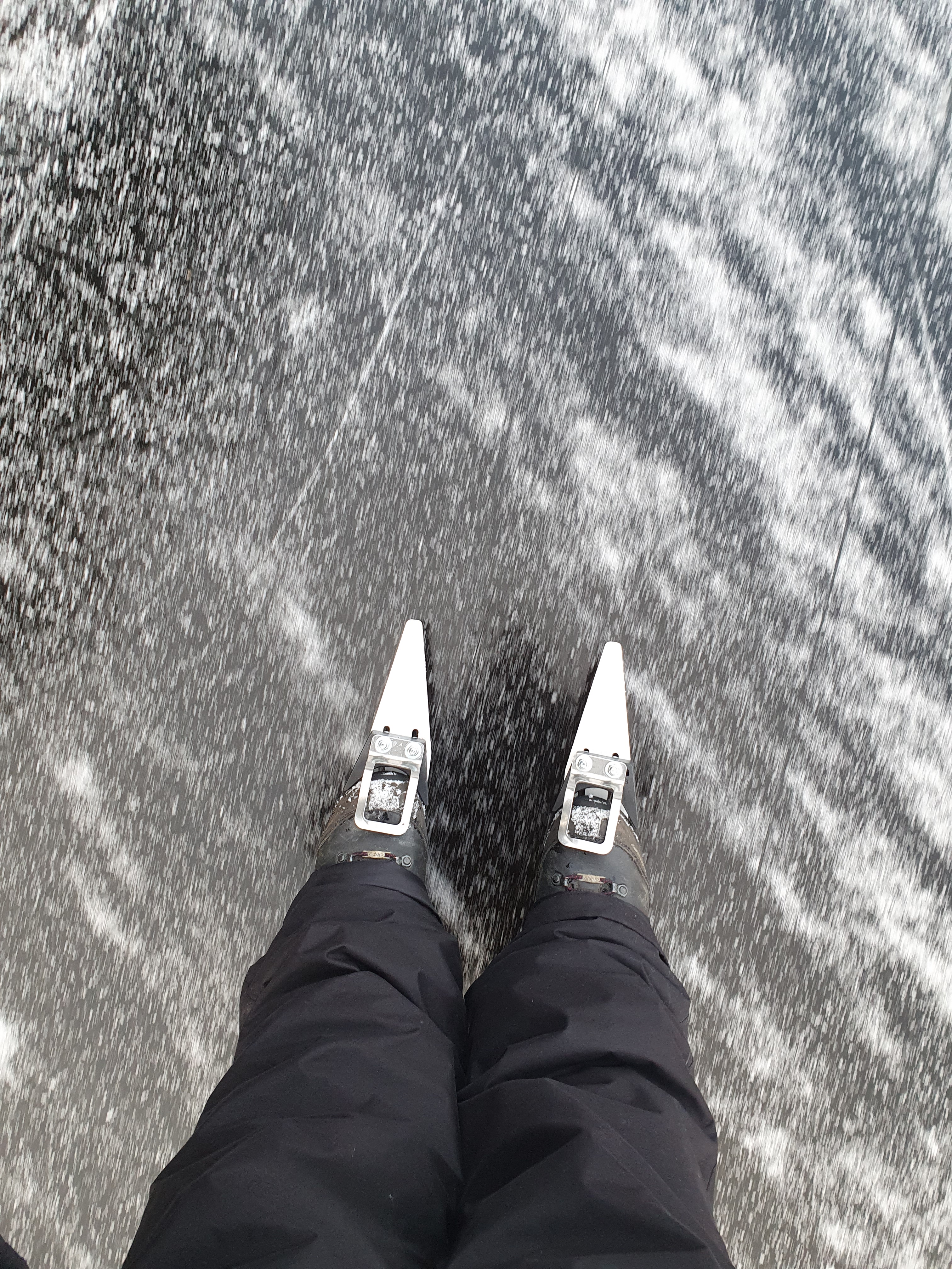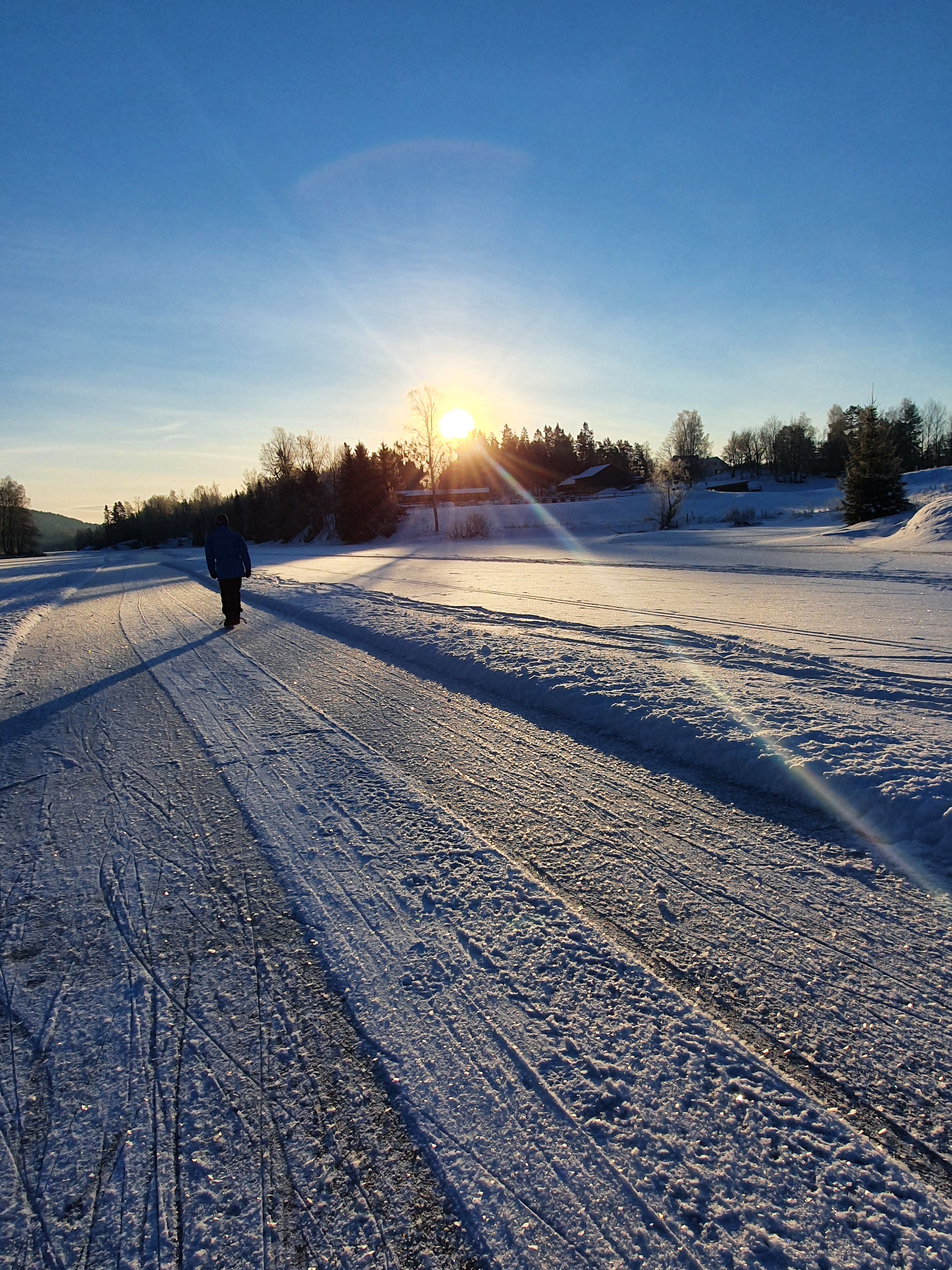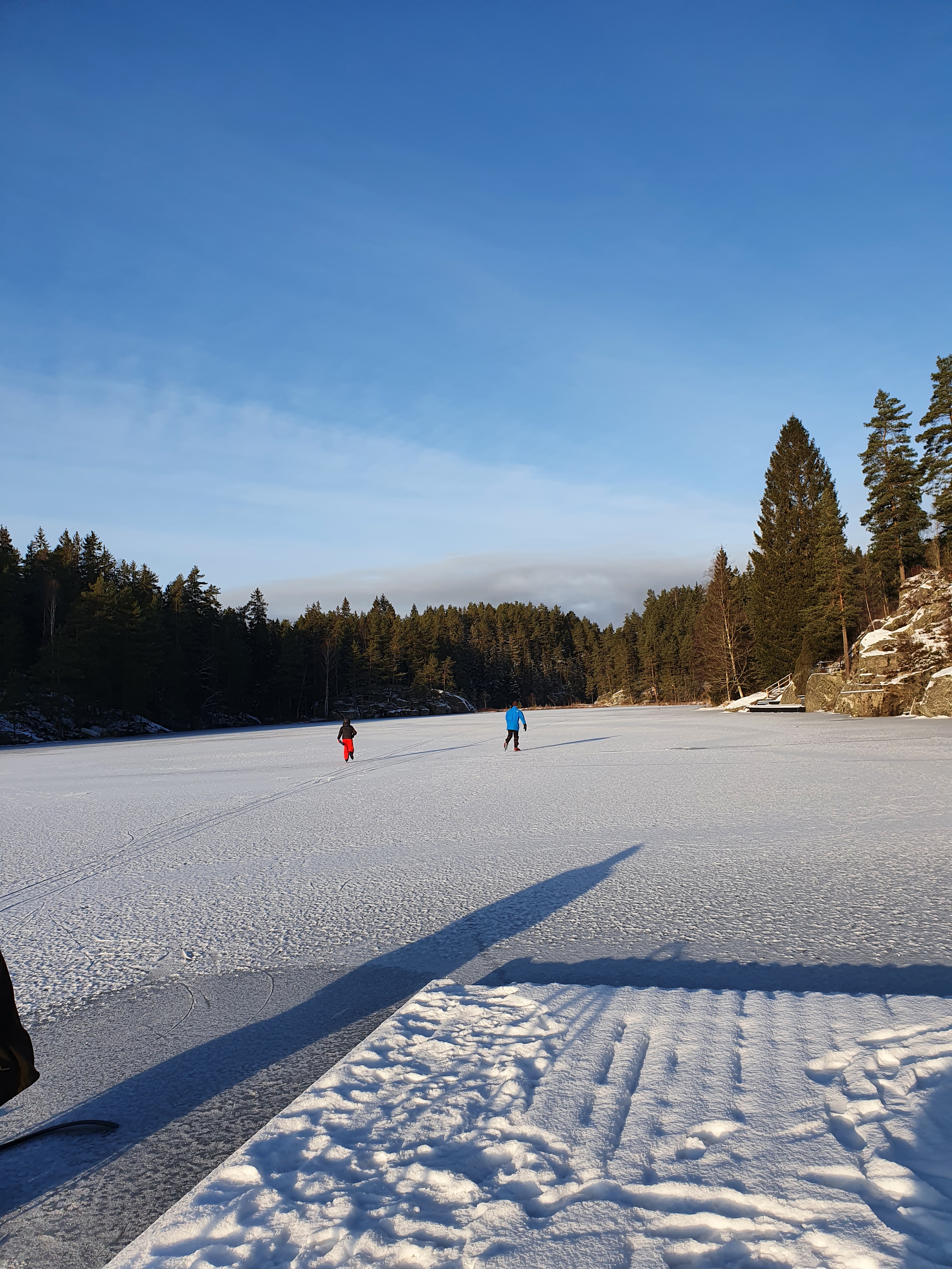 Etter noen hundre meter snur vi. Dette gidder vi ikke. Vi bestemmer oss for å dra hjem og ta på skøyter og gå på isen hjemme i stedet.