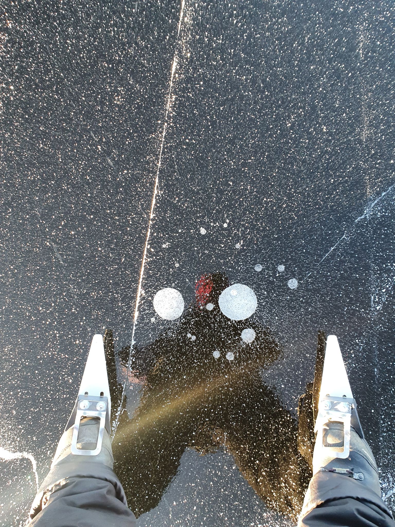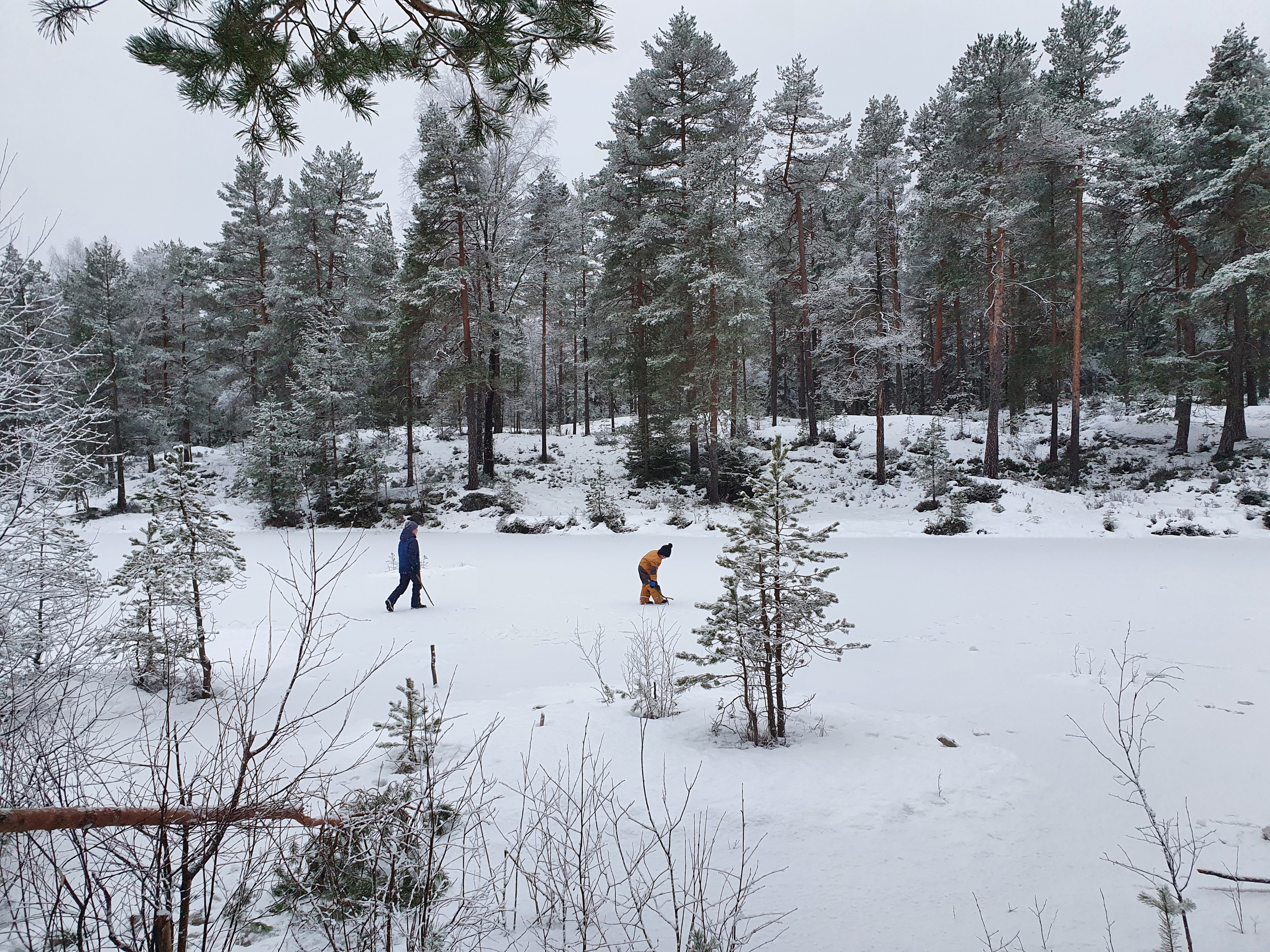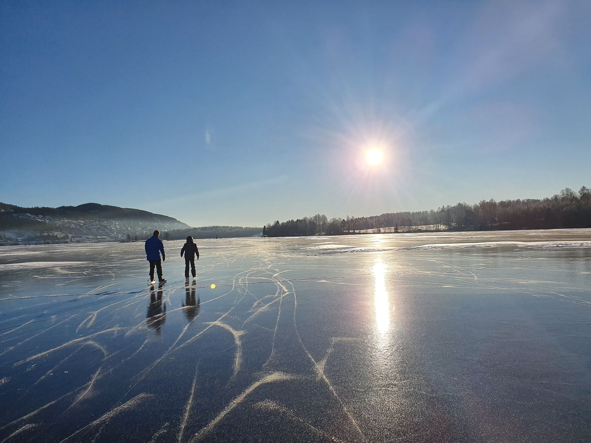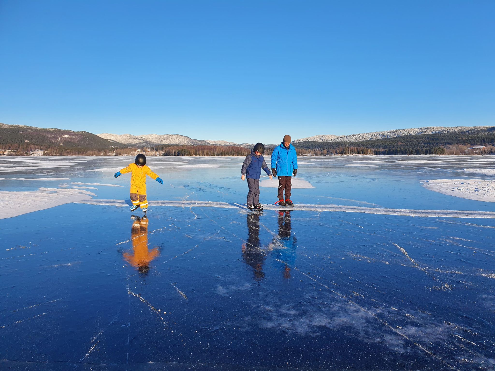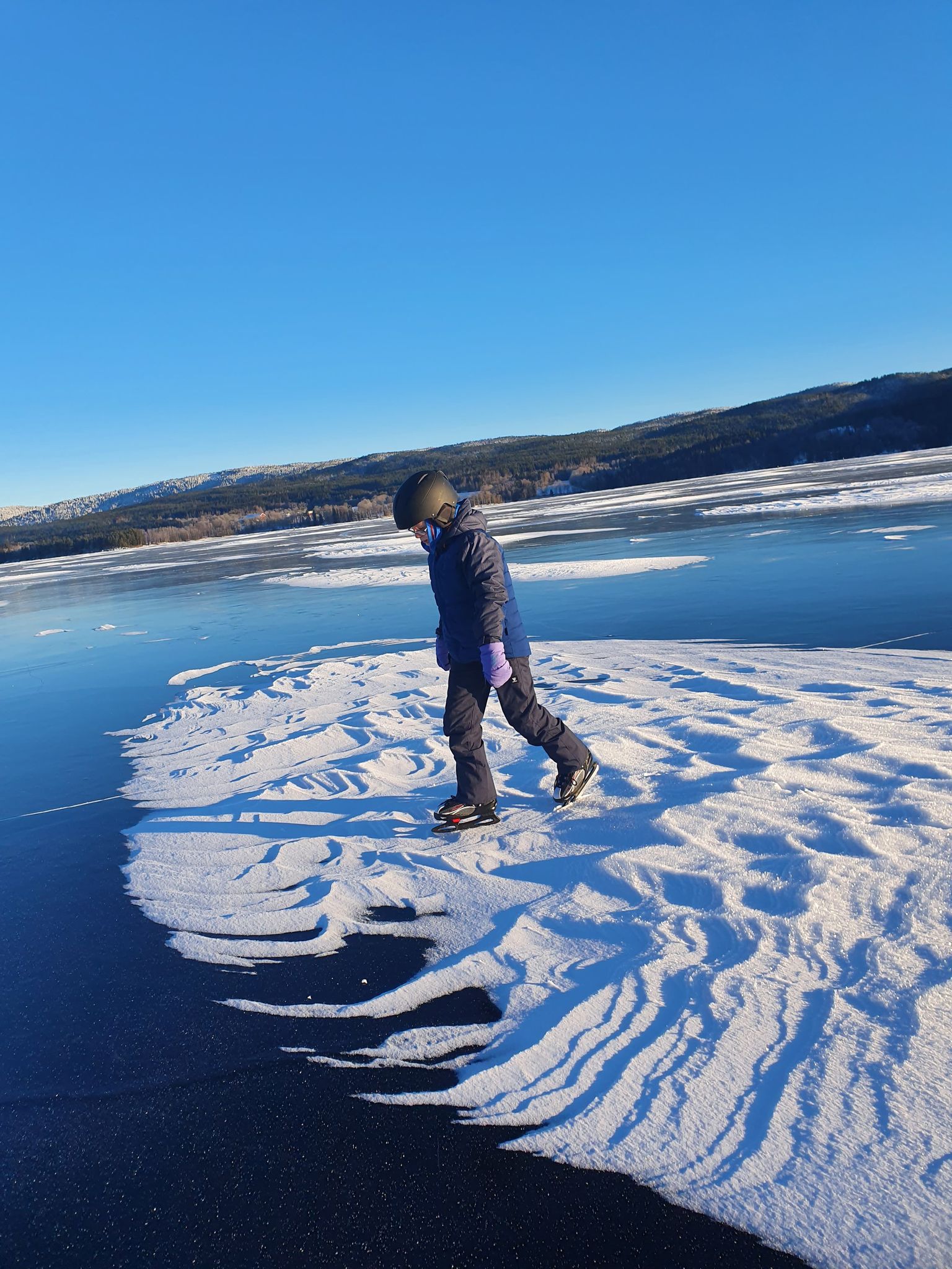 Etter noen hundre meter snur vi. Dette gidder vi ikke. Vi bestemmer oss for å dra hjem og ta på skøyter og gå på isen hjemme i stedet.