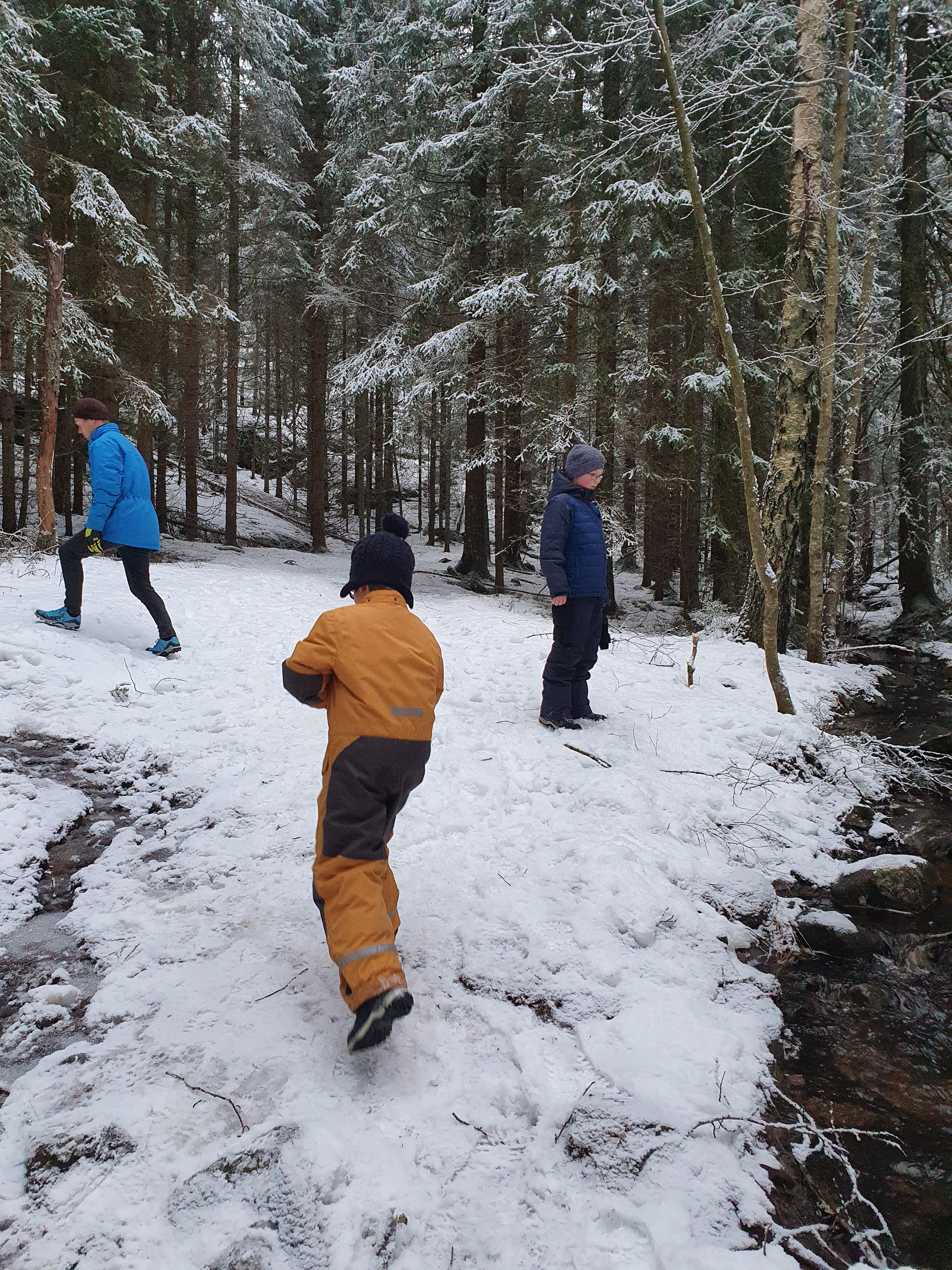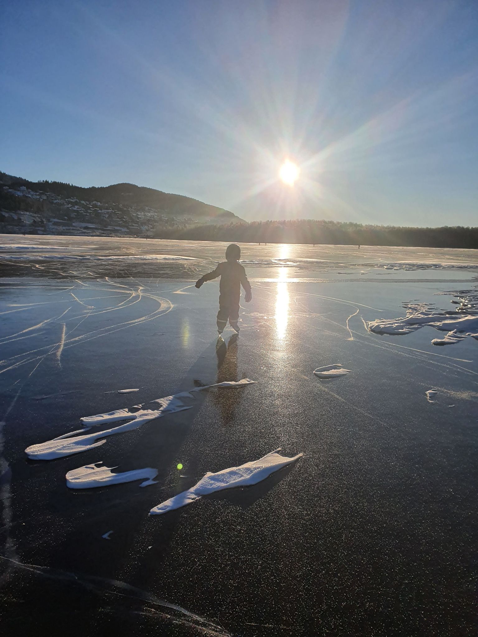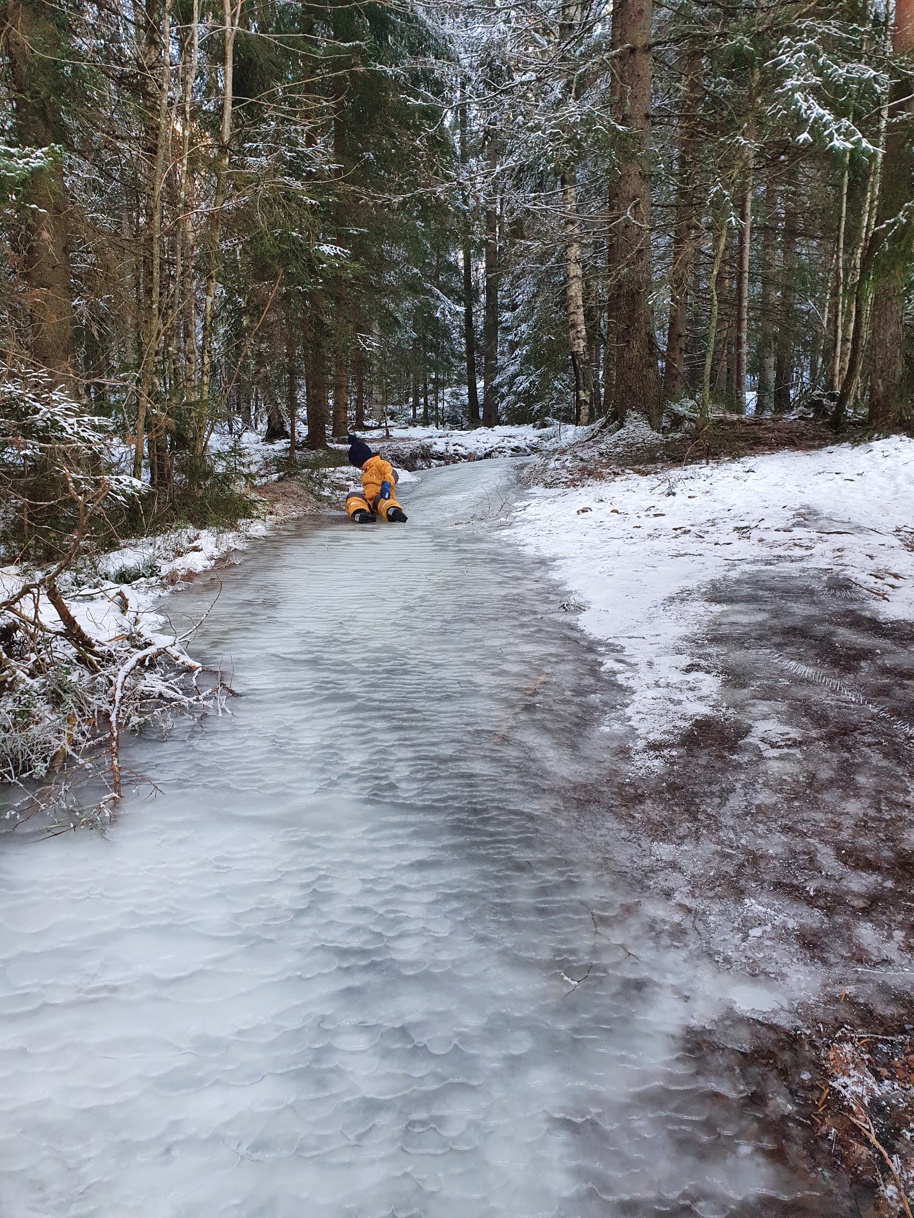 Så får vi øye på naturens egen sklie! En bekk har fryst skikkelig til. Vi tar av skia og Elvin tester. Joda, den skia fungerer utmerket. Vi blir en stund og leker på isen.