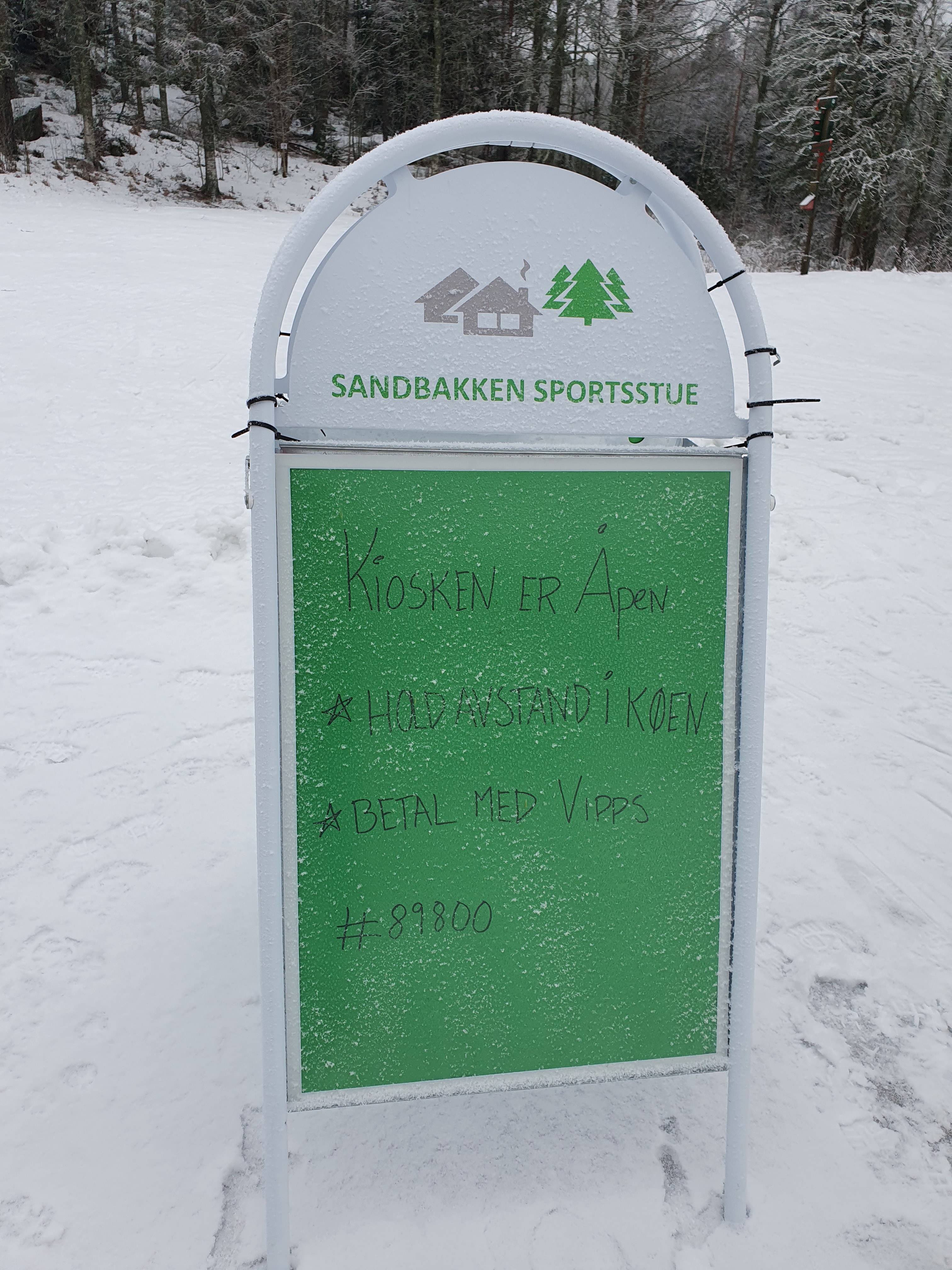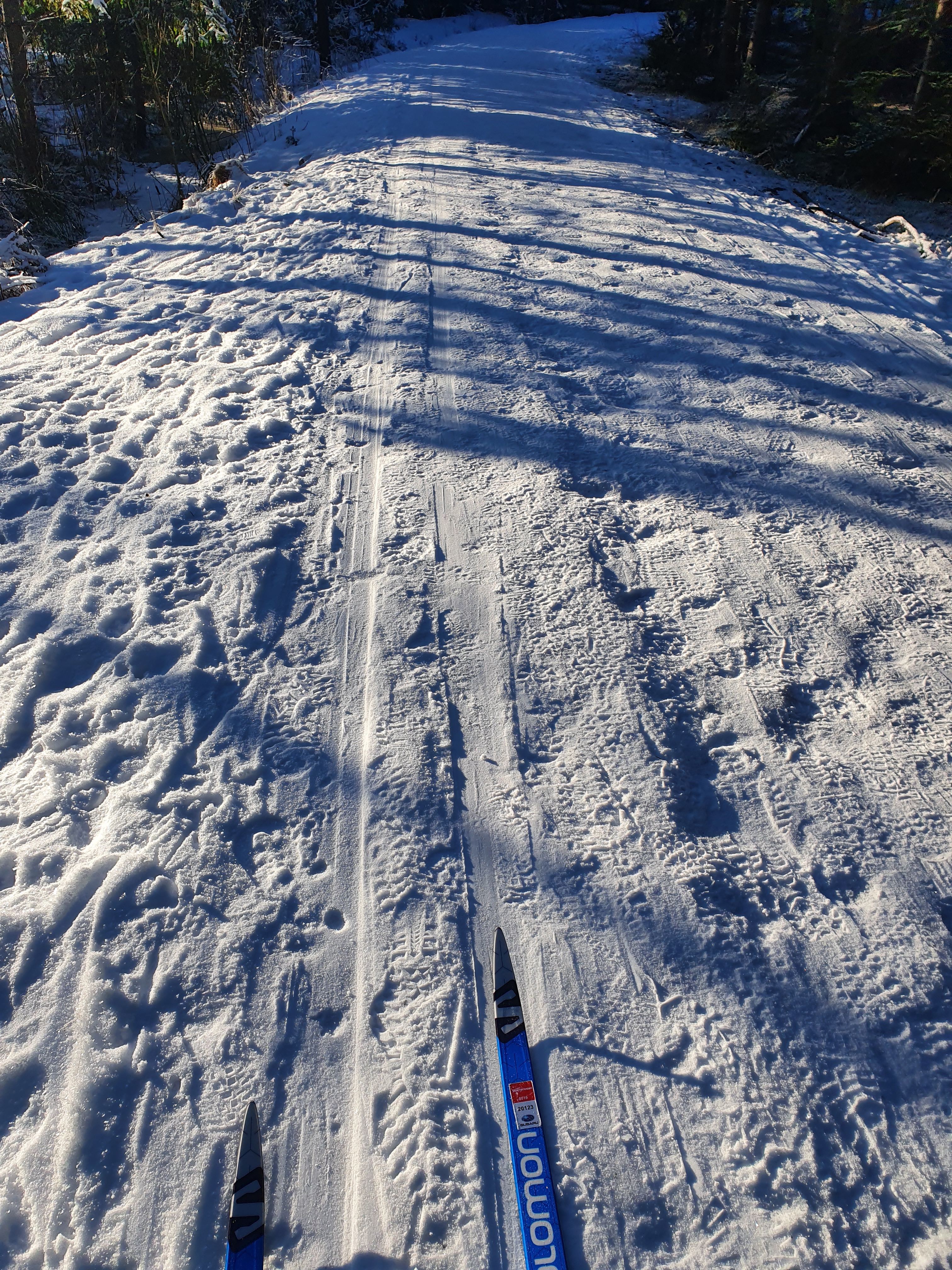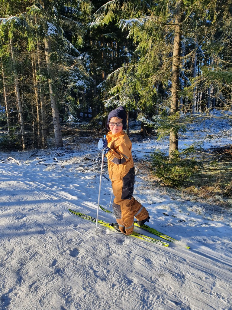 Jeg kikket på Skiforeningen sitt løypekart før vi dro. Ingen nykjørte løyper i vårt område på noen dager, men denne løypa pleier å være fin. Vi går de få meterne fra bilen og opp til løypa. Nedtur! Hvor er løypa? Vi ser konturene av noe som har vært skiløype en gang, i kanten… nå er det fotspor over alt! Vi spenner likevel på oss skia og går et par hundre meter mot krysset ved hytta. Men det er ikke tegn til bedre spor. Flere folk passerer oss gående og joggende.. her har vi bomma! Vi snur, Elvin lurer litt på hvor sporene er, men humøret er på topp!