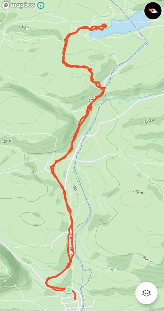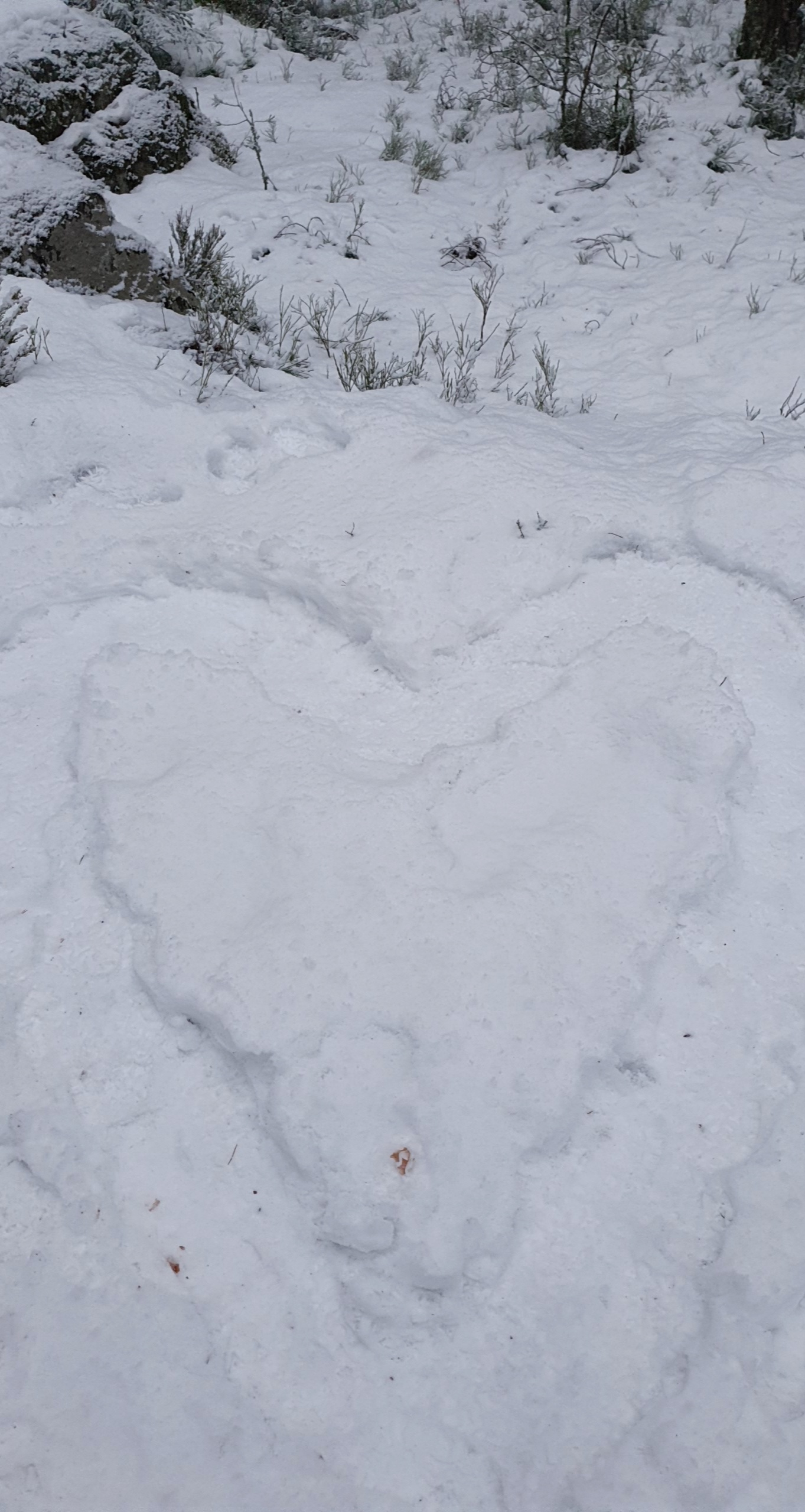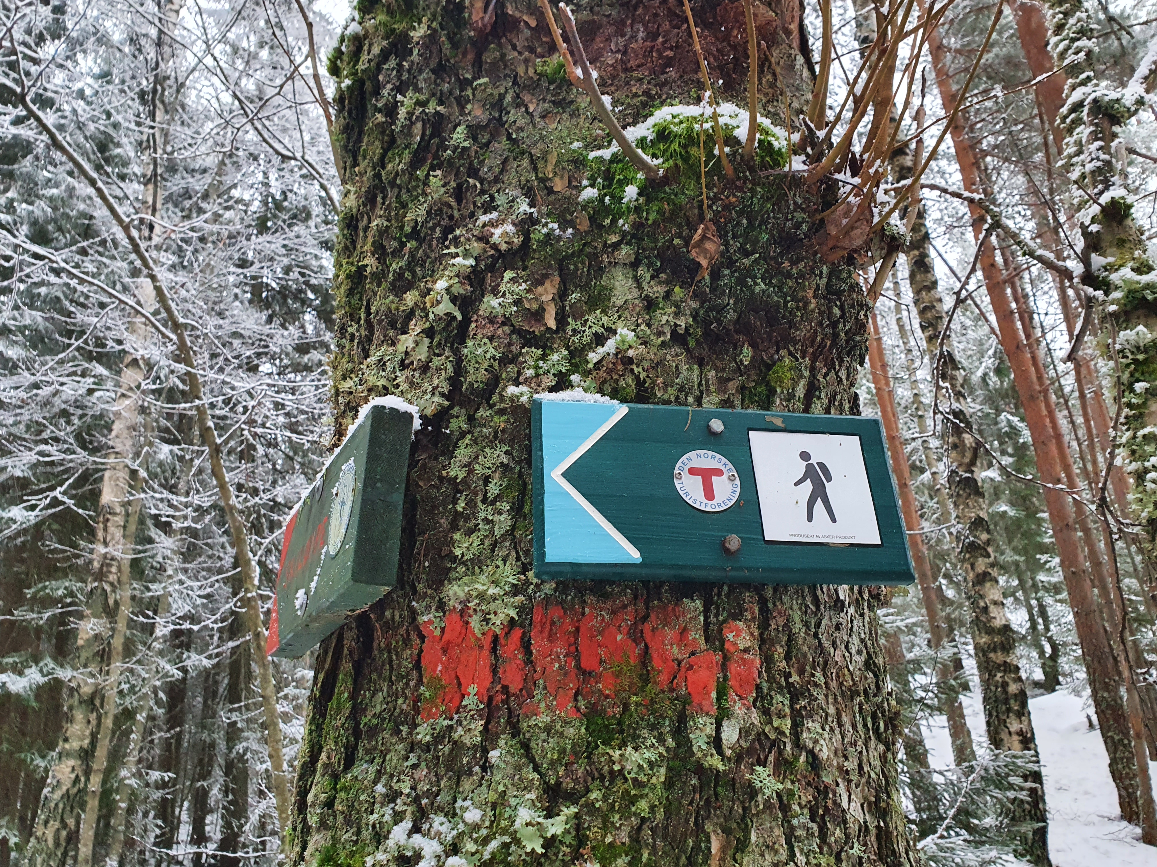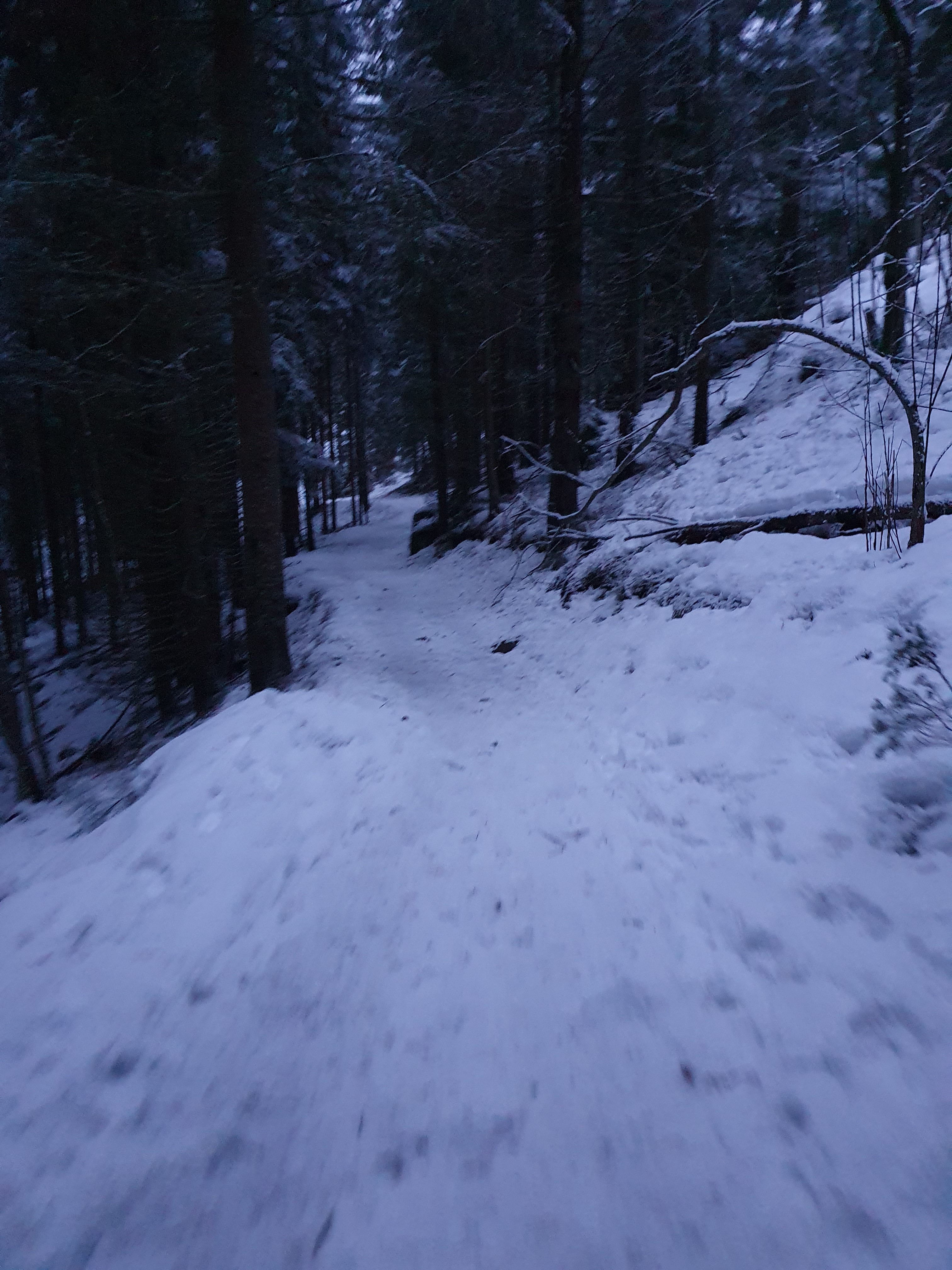 Jeg kikket på Skiforeningen sitt løypekart før vi dro. Ingen nykjørte løyper i vårt område på noen dager, men denne løypa pleier å være fin. Vi går de få meterne fra bilen og opp til løypa. Nedtur! Hvor er løypa? Vi ser konturene av noe som har vært skiløype en gang, i kanten… nå er det fotspor over alt! Vi spenner likevel på oss skia og går et par hundre meter mot krysset ved hytta. Men det er ikke tegn til bedre spor. Flere folk passerer oss gående og joggende.. her har vi bomma! Vi snur, Elvin lurer litt på hvor sporene er, men humøret er på topp!