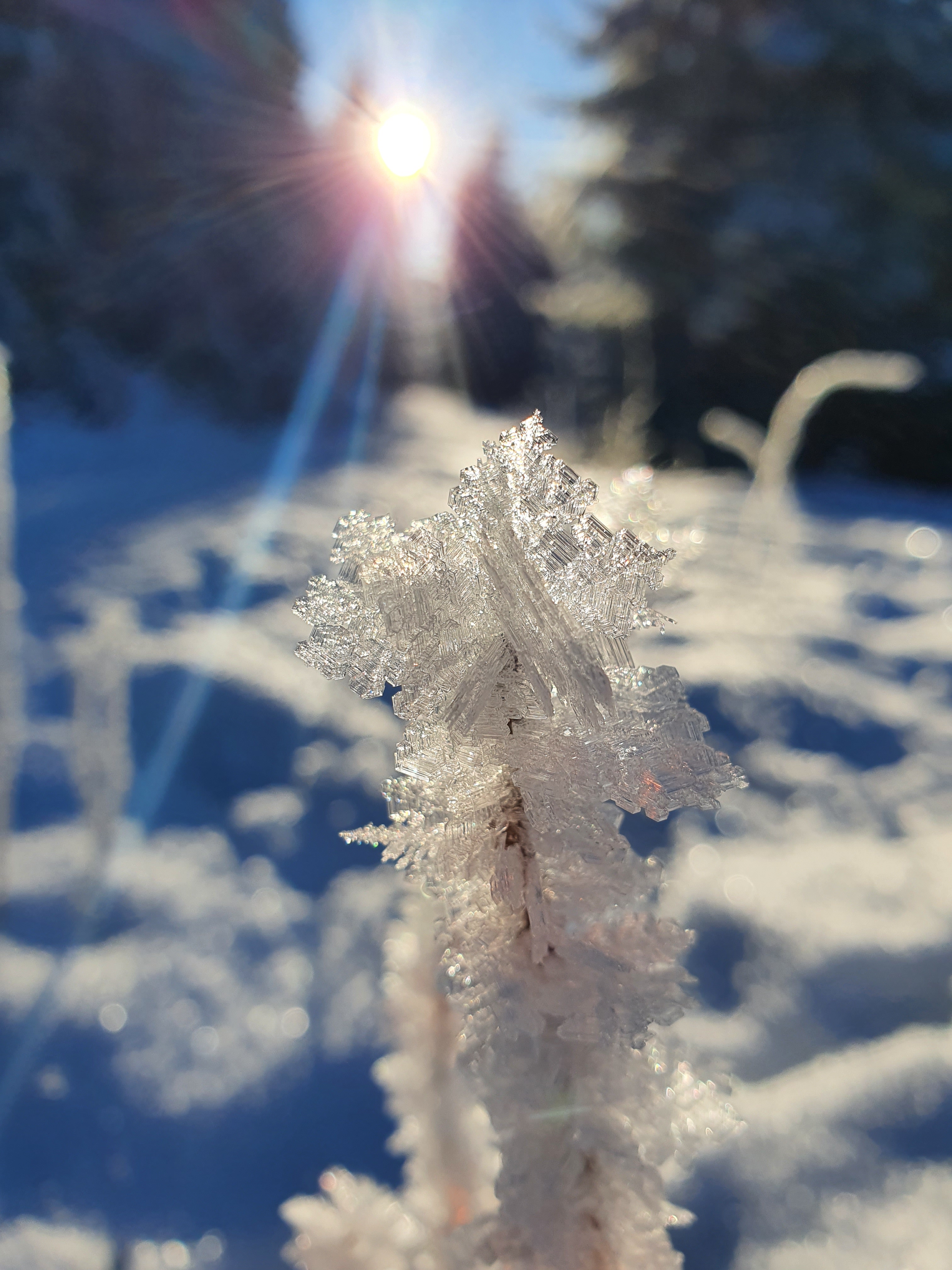 Etter en stund går vi videre. Vi studerer og tar bilder av iskrystaller, og jammen meg er det noen istapper på fjellveggen også. En liten stund glemmer vi de elendige skisporene. Helt til Elvin faller og lander hardt på rumpa. Da er ingen ting gøy en liten stund. Brillene dugger, og Elvin ser ingen ting!
