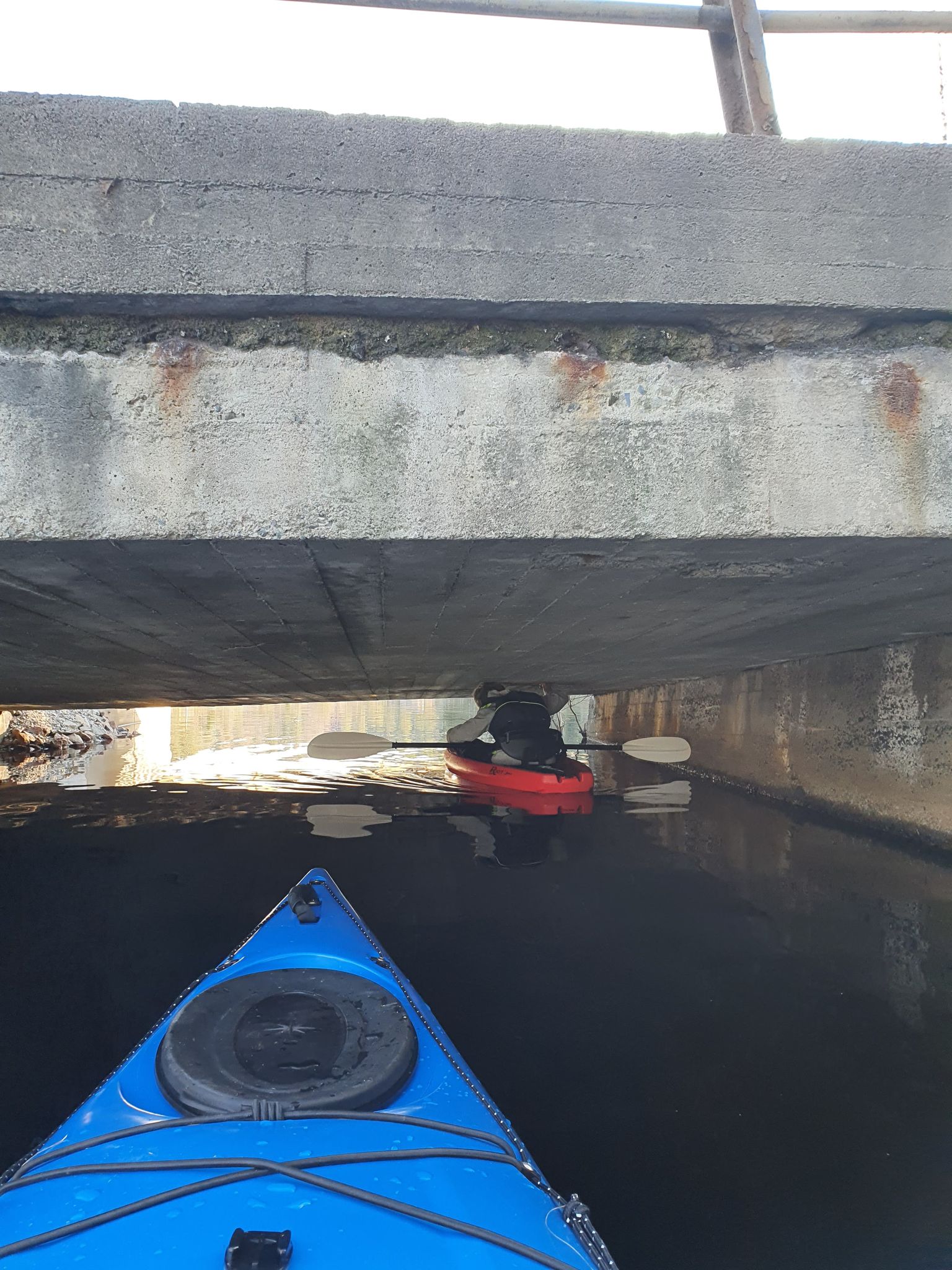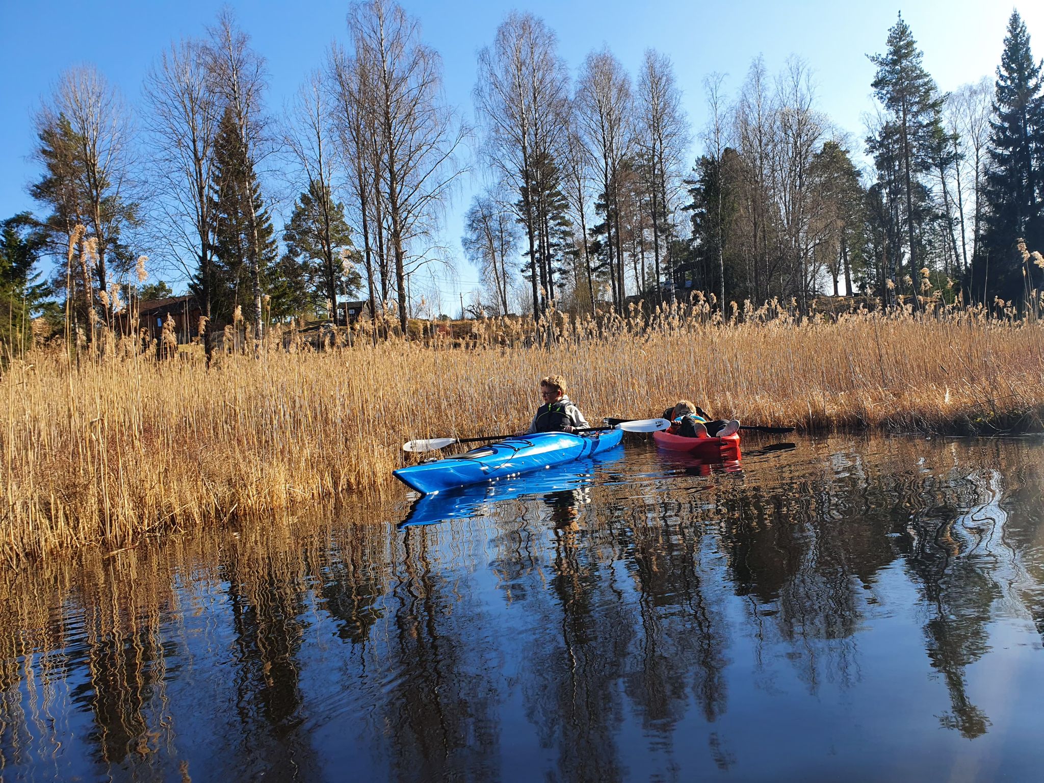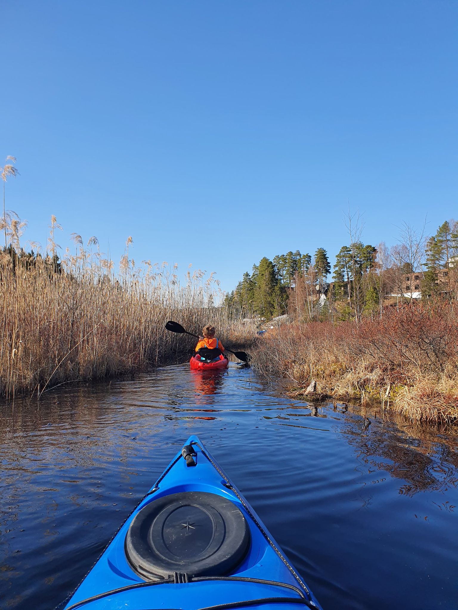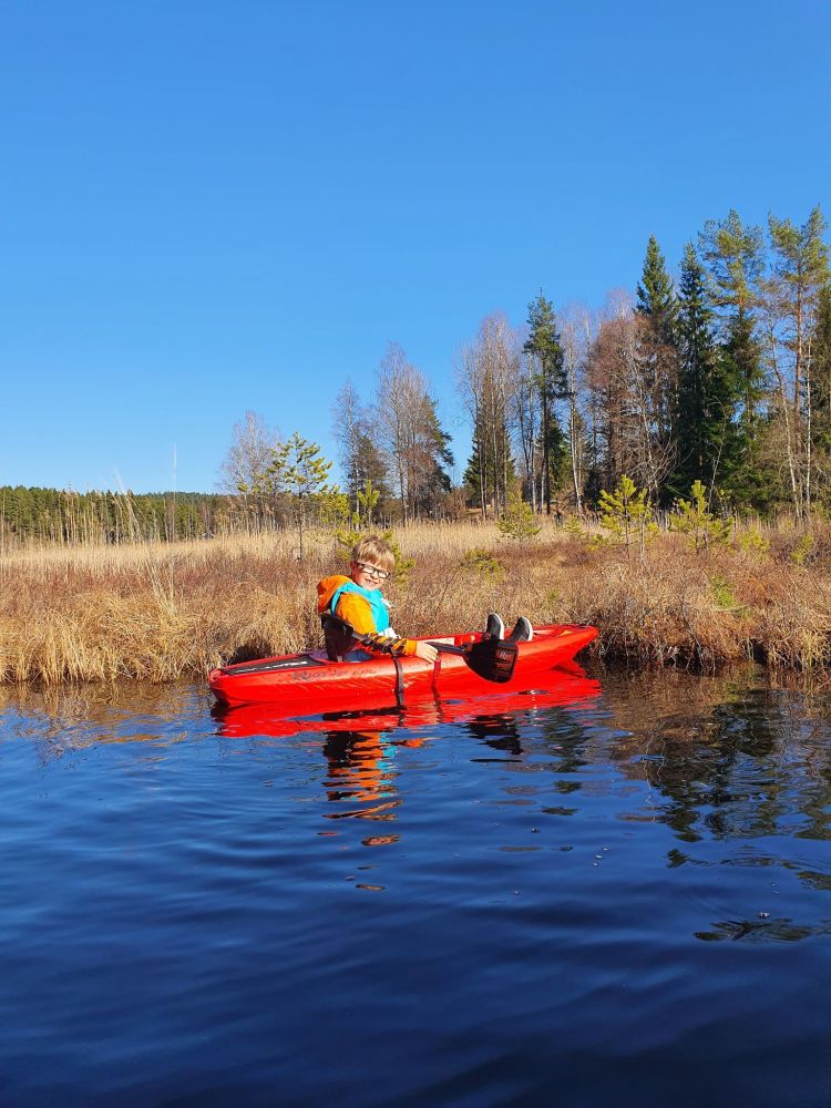 På vannet «vårt» er det mange kriker og kroker å utforske, og vi er innom de fleste av de. 8-åringen har god kontroll på kajakken, både bakover og framover. Han snur enkelt, og holder greit følge når han padler på litt. Etter å ha lekt litt i sivet skal vi snu og padle tilbake. Da ser jeg hvor vått det faktisk er i kajakken hans. Han er klissvåt og sitter i en vanndam. Det er bare å komme seg inn og skifte.