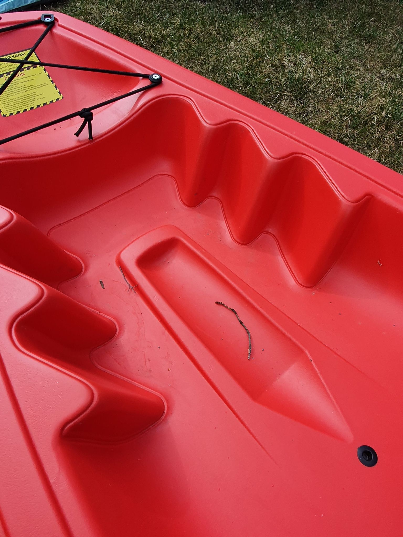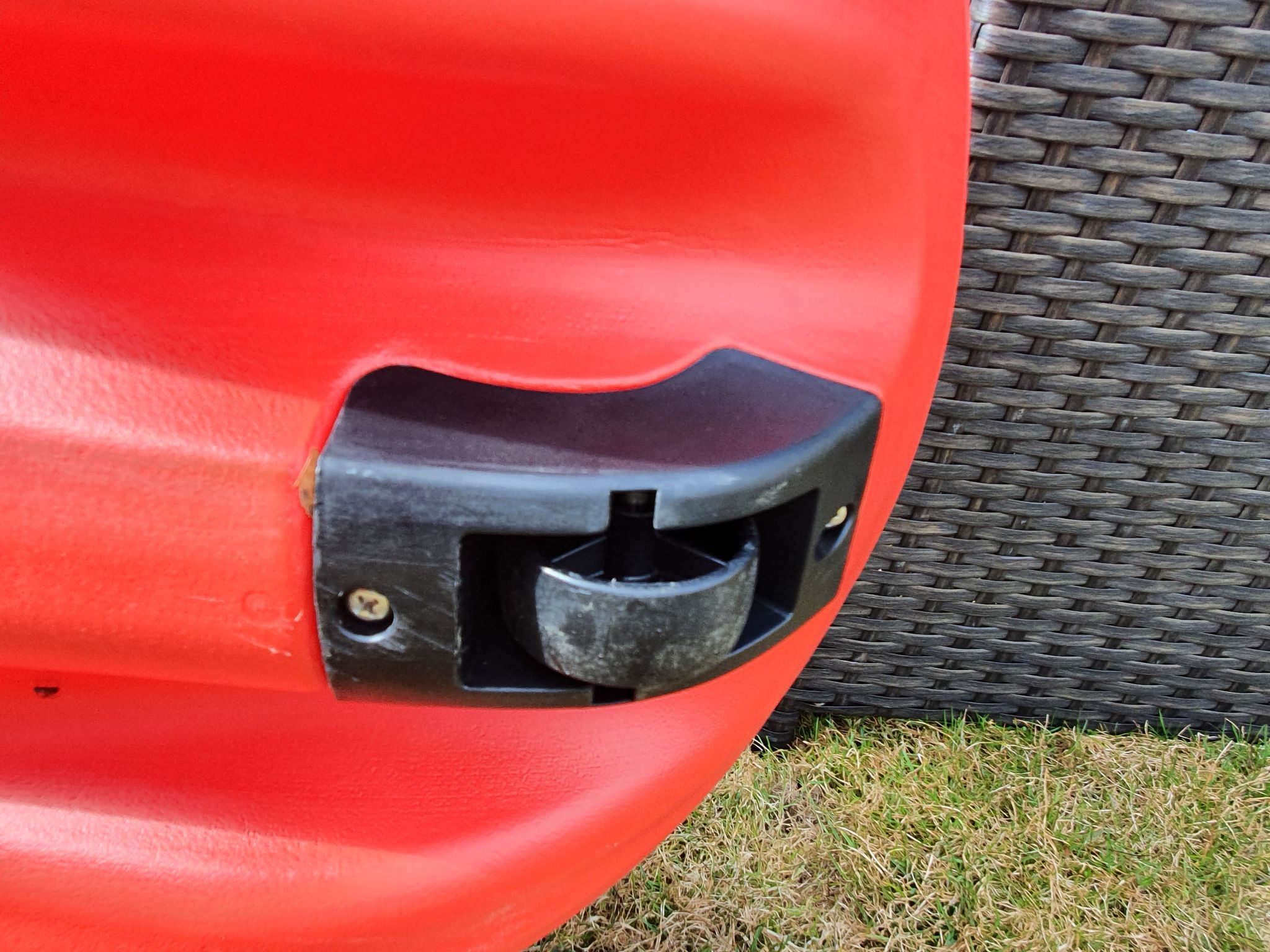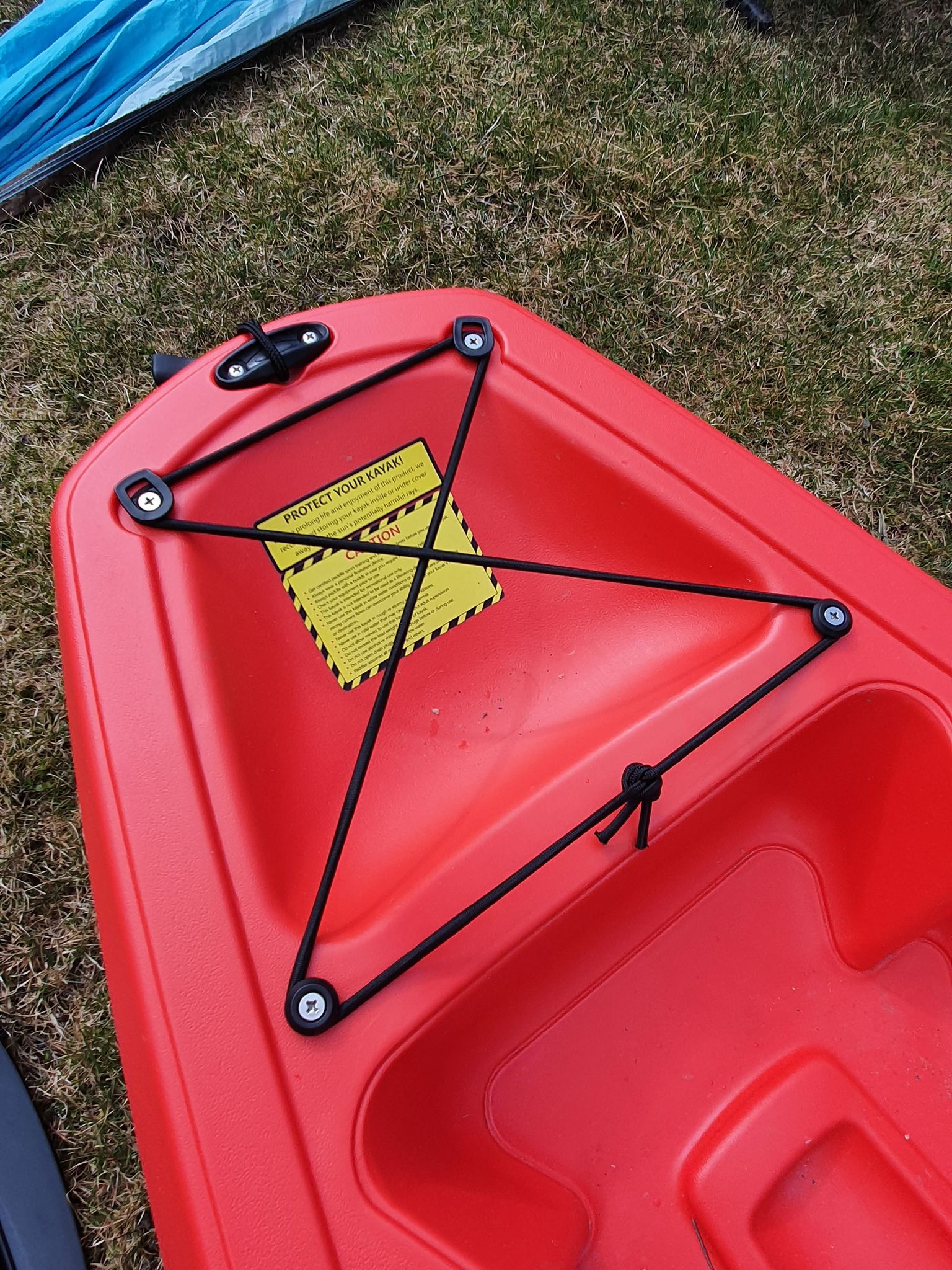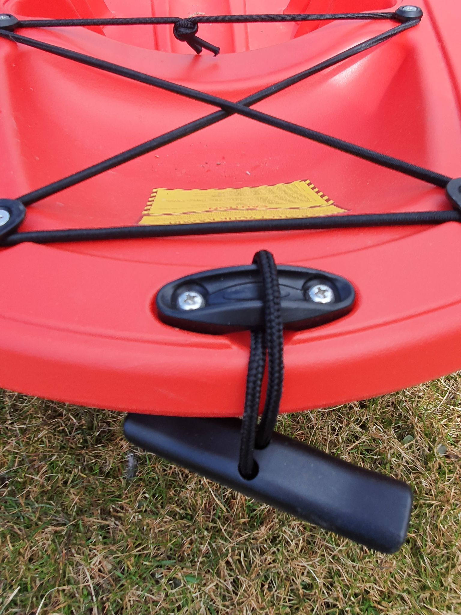 Først og fremst litt fakta. Kajakken er 185 cm lang, sånn tålelig tung (det er ikke noe problem for oss voksne å bære den i en arm) og fin og rød. Den kommer med en enkel barneåre. Det er ryggstøtte i kajakken som legger seg ned når det ikke er i bruk, og som kan justeres. Bak er det et lite «lasterom» med mesh over, og foran er det en fordypning med strikk over, så det er mulig å ha med litt bagasje. Mellom beina i kajakken er det et hull som er ment for at vannet skal renne ned i, og en fordypning hvor man kan legge en flaske. På sidene er det bærehemper, og foran er det et håndtak. Under bak er det et lite hjul, slik at det er mulig å dra kajakken på land. Det er anbefalt maksvekt på 55 kilo på personen som skal bruke kajakken.