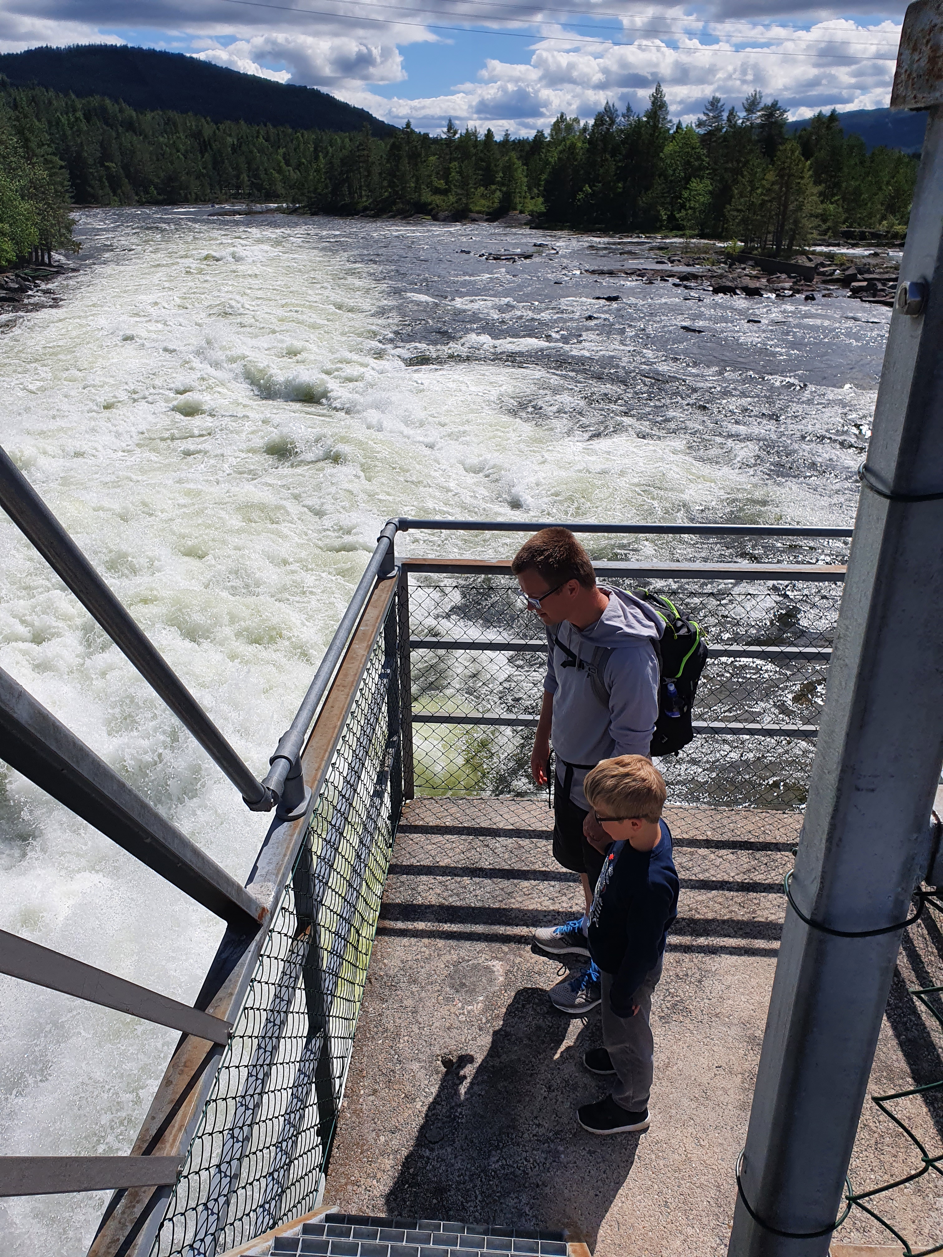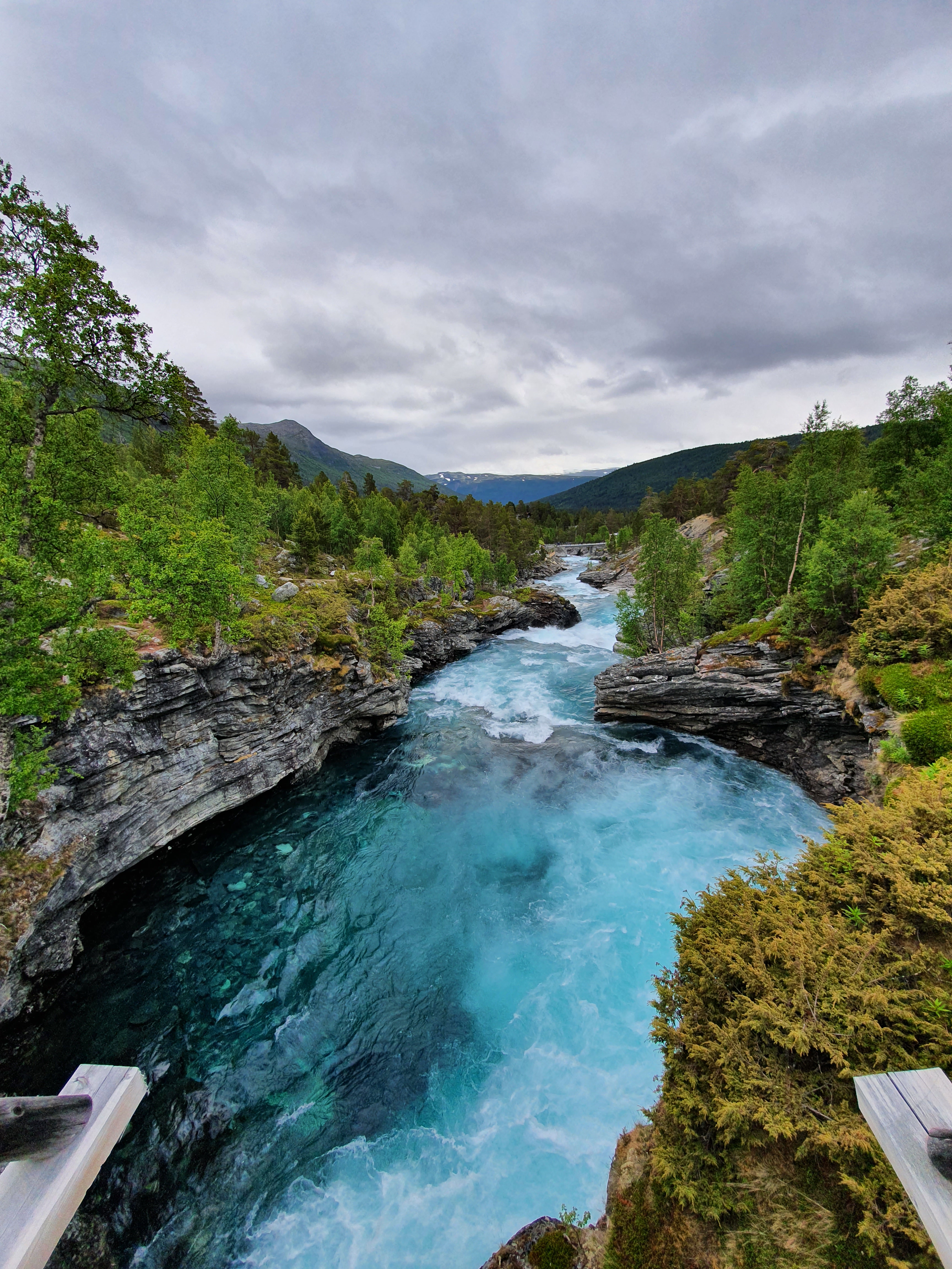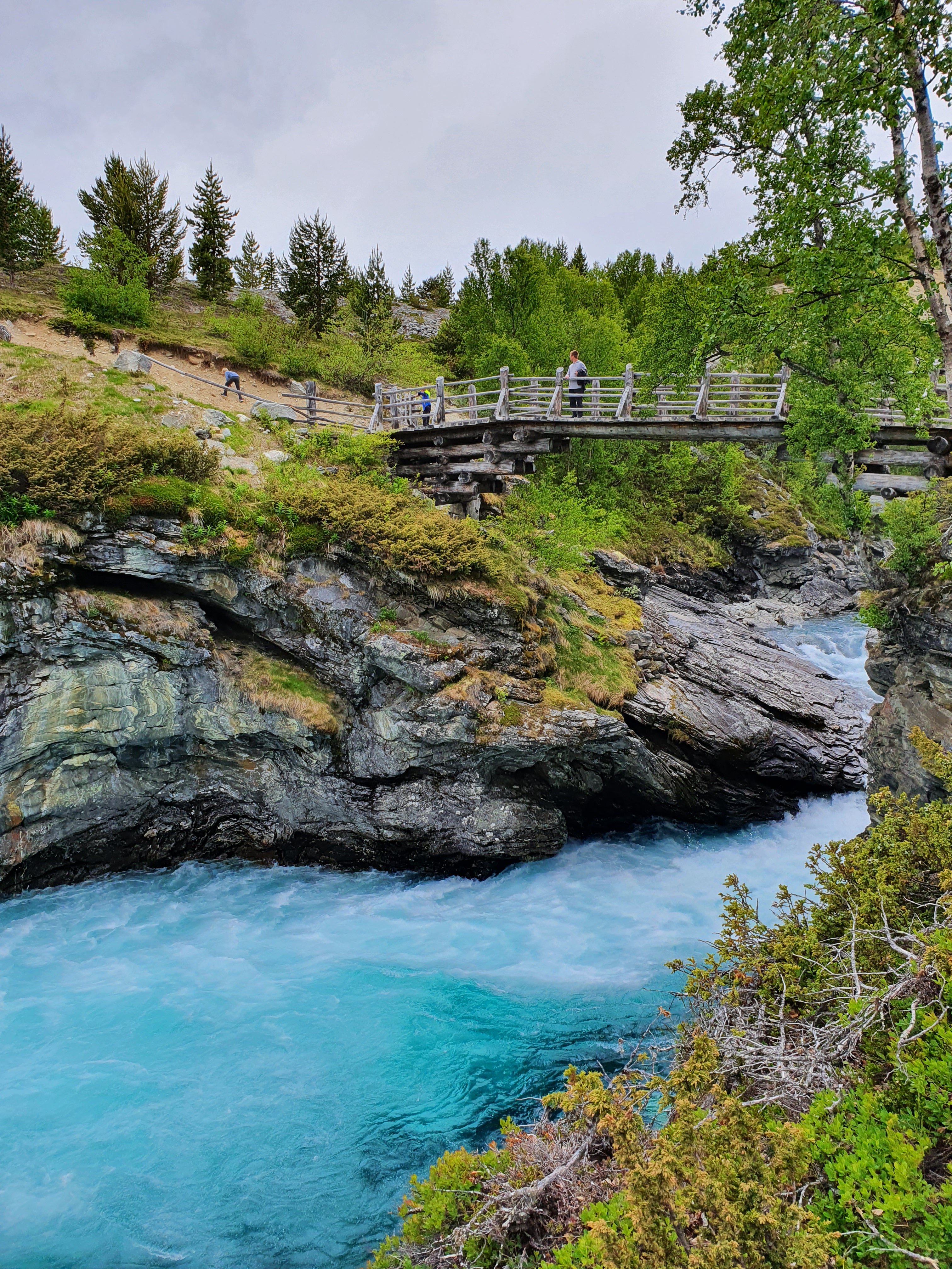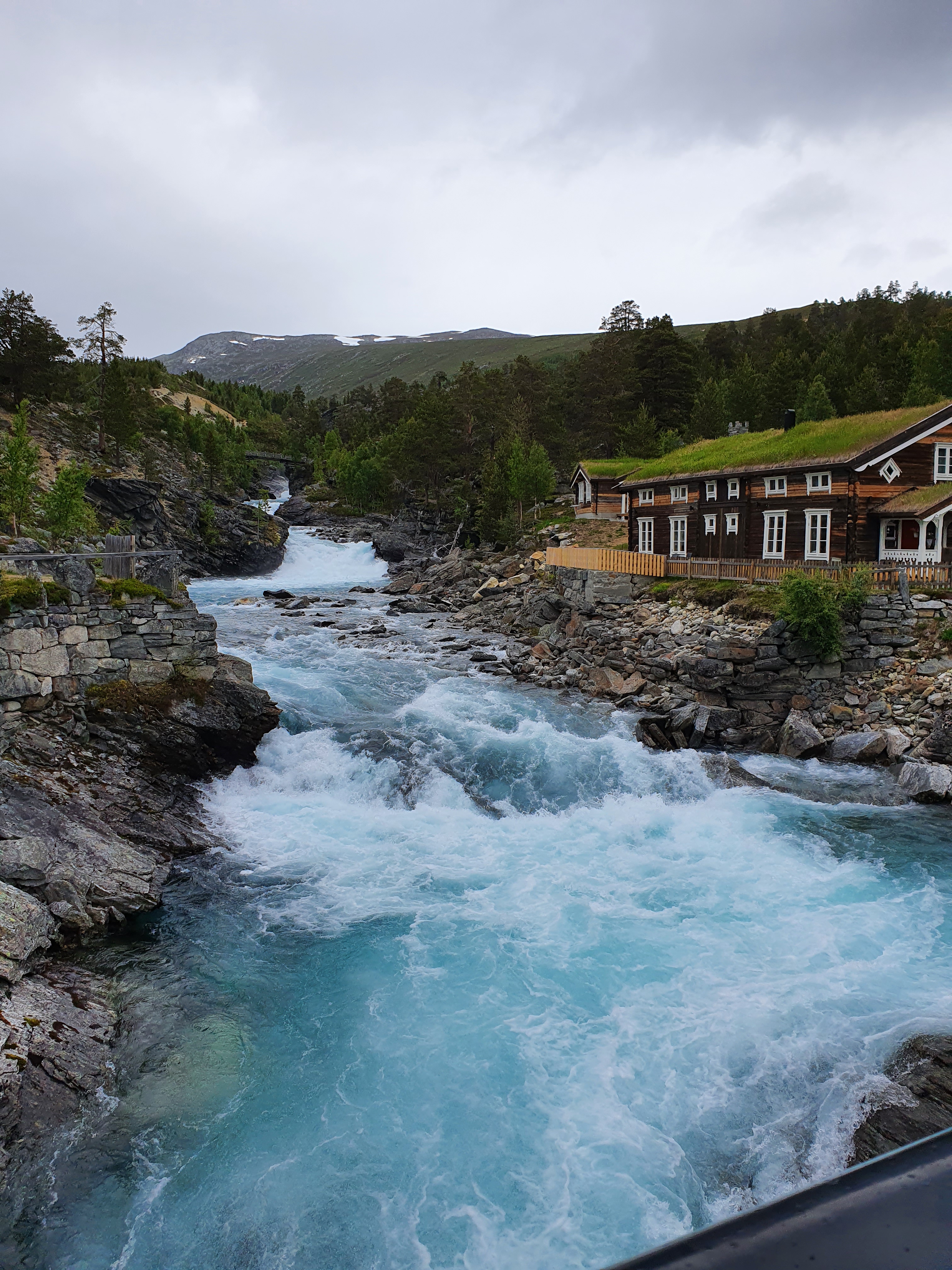 Med magen full av boller gikk turen videre mot fjellet og Grotli. Plutselig fikk vi øye på en kul foss på høyre side, og fikk bråbremset og kjørt inn mot fossen. Dette skulle vise seg å bli dagens høydepunkt. Vi fant ut at vi var ved Billingen Seterpensjonat ved foten av Reinheim nasjonalpark. Her var det fine områder å gå tur i. Vi gikk opp langs fossen til en veldig spennende bru. Vannet i elva var helt turkis. Anbefaler en stopp der om dere kjører forbi. De tilbyr også overnatting og har en kafe med servering.