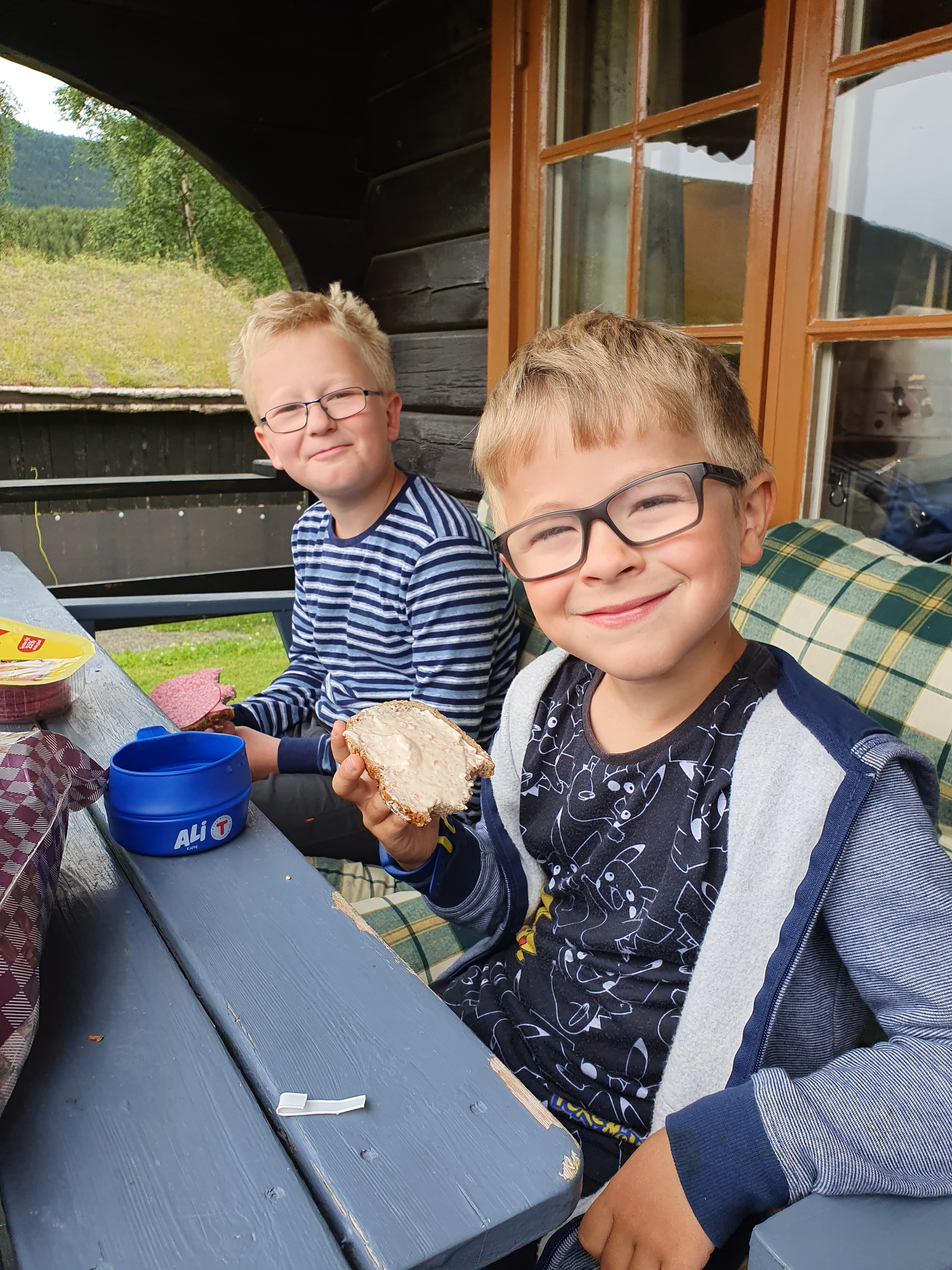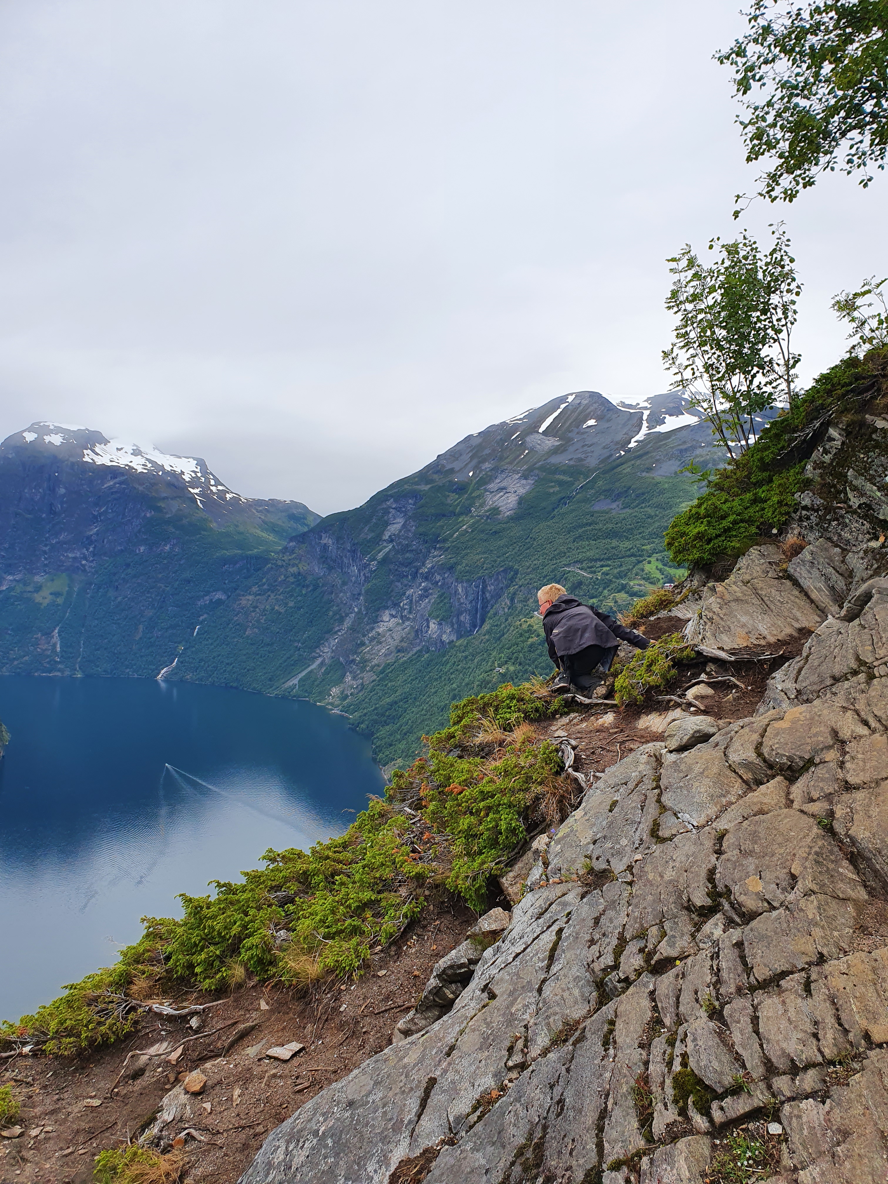 Etter en god natts søvn i høyden, kjørte vi opp til Westerås for å gå en spektakulær tur vi har gått før. Det går en sti mot Løsta fra gården, med mange fantastiske utsiktspunkter ned i fjorden. Løsta ligger på 500 meter, og du ser Geiranger, fjorden og Ørnevegen derfra. Det er mulig å parkere ved gården, men da forplikter du deg til å enten spise der eller overnatte, men det er det verdt. Det er virkelig verdt å gå turen til Løsta før man tar seg en matbit i restauranten. Det kan hende du må booke på forhånd, for her har vi inntrykk av at det er populært. På gården har de sauer, geiter og lamaer som går rundt, og det er fullt mulig å hilse på de. Jeg vil vel påstå at det er vanskelig å ikke hilse på de. Vi fikk i alle fall følge av noen geiter et godt stykke på veien, til stor glede for guttene!