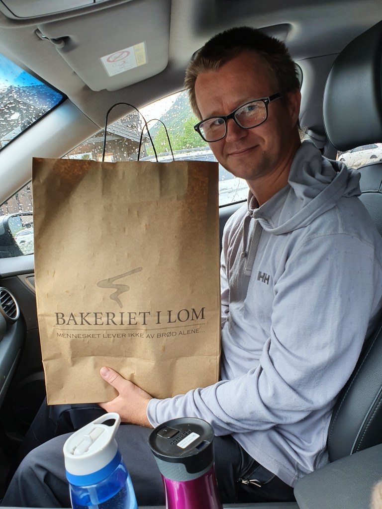 Neste dag fortsatte ferden mot Geiranger. Første stopp ble i Lom, vi måtte jo innom bakeriet i Lom. Det er vi aldri alene om, køen sto langt ut på plassen. Ikke så rart når de har helt fantastiske kaker, brød og boller.