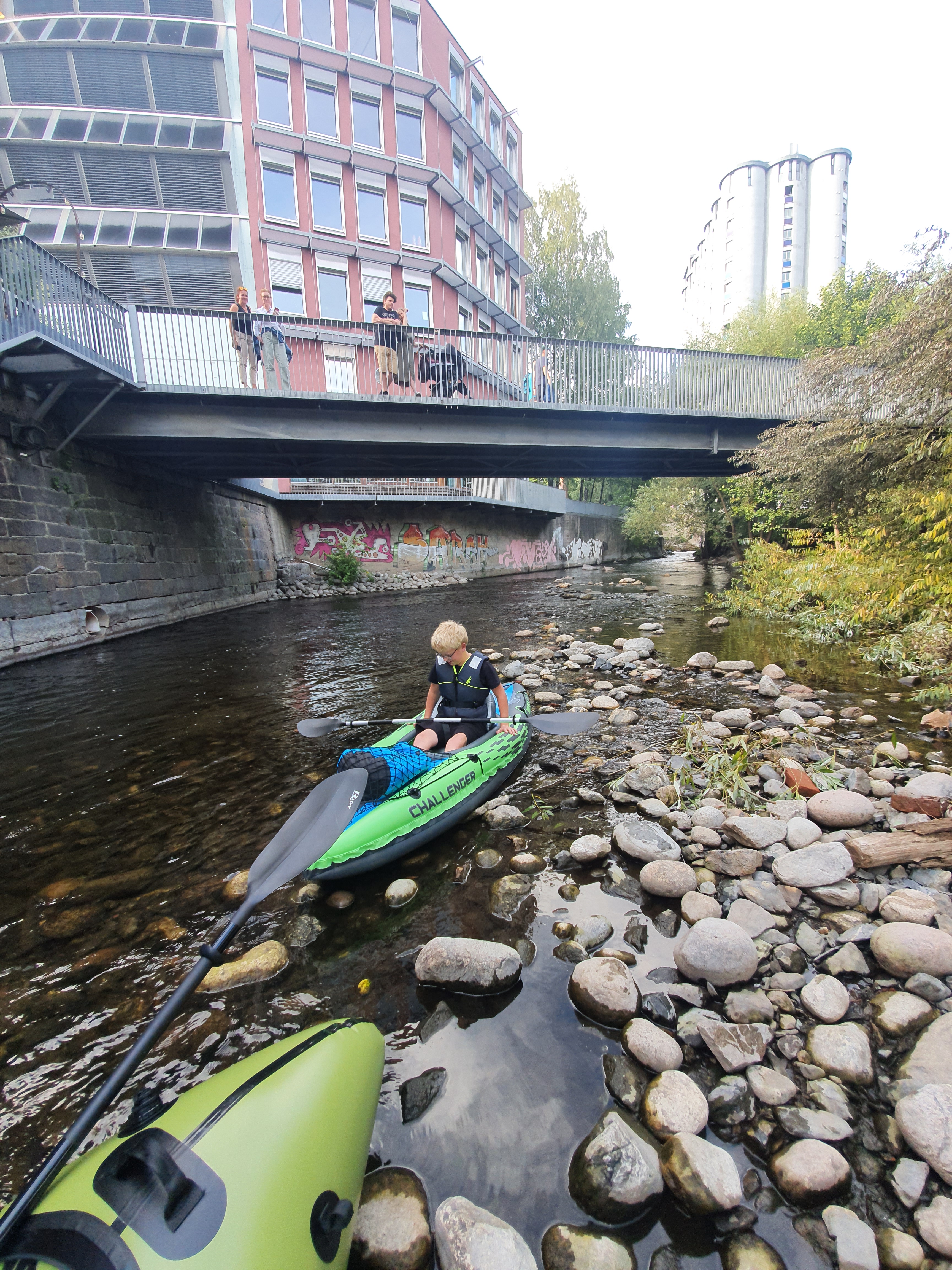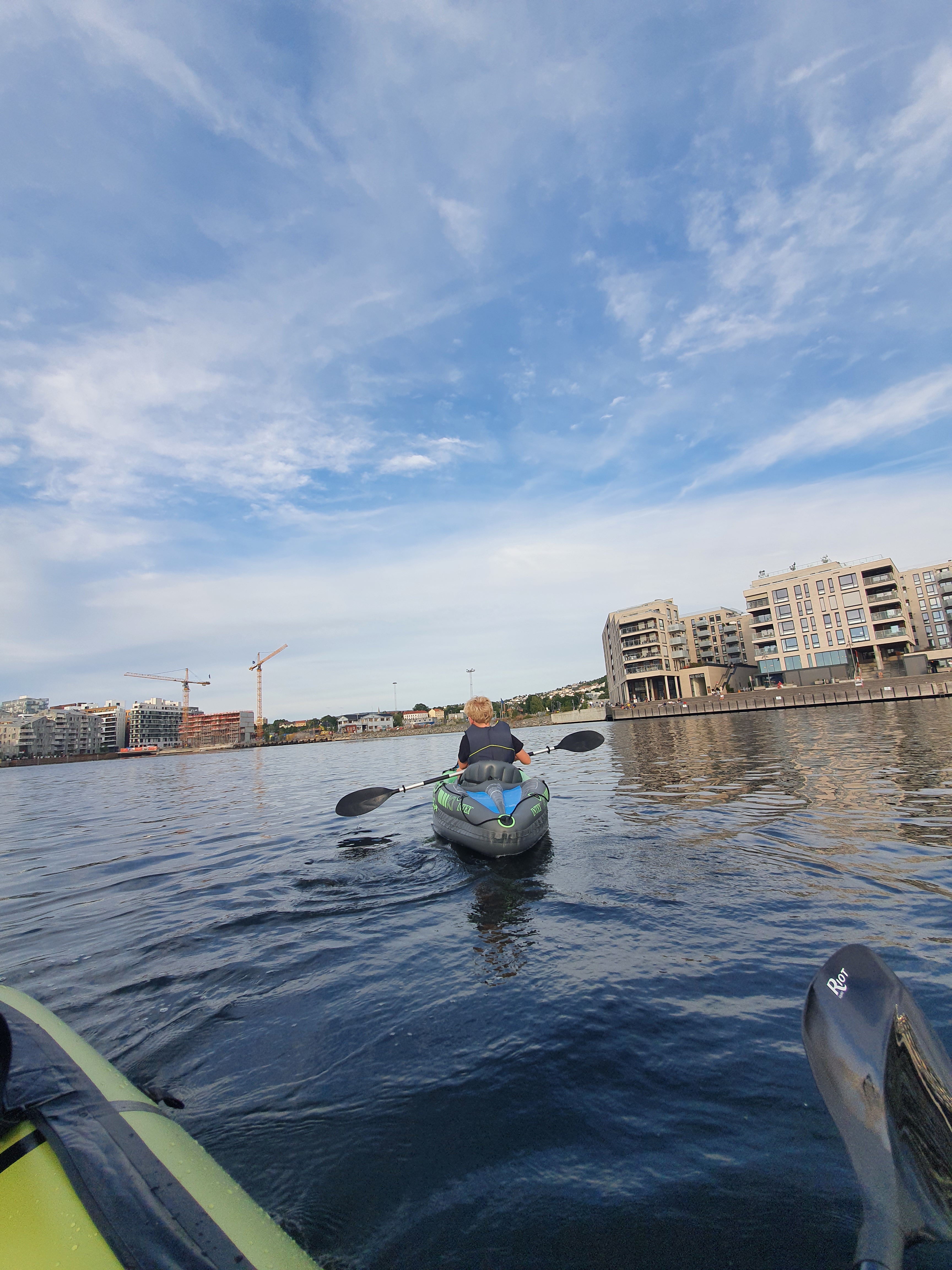 Neste test er Akerselva ned fra Mathallen til Sørenga og Barcode. Her kommer bagen til sin rett, da alt kan pakkes i den. Skal man bære over lenger distanse ville jeg nok puttet den i en sekk. Men det går fint å bære den over skuldra noen hundre meter. Vi parkerer på Vulkan, og blåser opp kajakken på gressletta på andre siden av brua fra Mathallen. Det er litt lite vann i elva, men vi tester likevel. Det går veldig greit. 12-åringen setter seg lite fast, til tross for at det er lav vannføring. Kajakken ligger ganske grunt i vannet, så den krever ikke så mye vann før den fungerer helt fint. Ned strykene går det fint å manøvrere den, og den gjør det i grunn bedre enn Rondane Packraft 250 i strykene der det er litt lite vann. Den er stabil, er ikke i nærheten av å velte og er lett å manøvrere. Selv på de flate partiene går det fint å padle, selv om kjølen ikke er på. Den er mer retningsstabil enn Packraften. Turen går nedover uten problemer. Fint med nett foran, slik at man kan legge en drybag under. Vil dog anbefale å feste denne med en karabinkrok e.l. tilfelle den skulle falle ut.