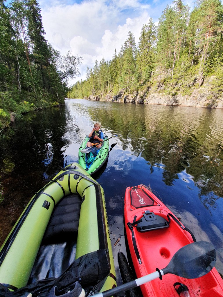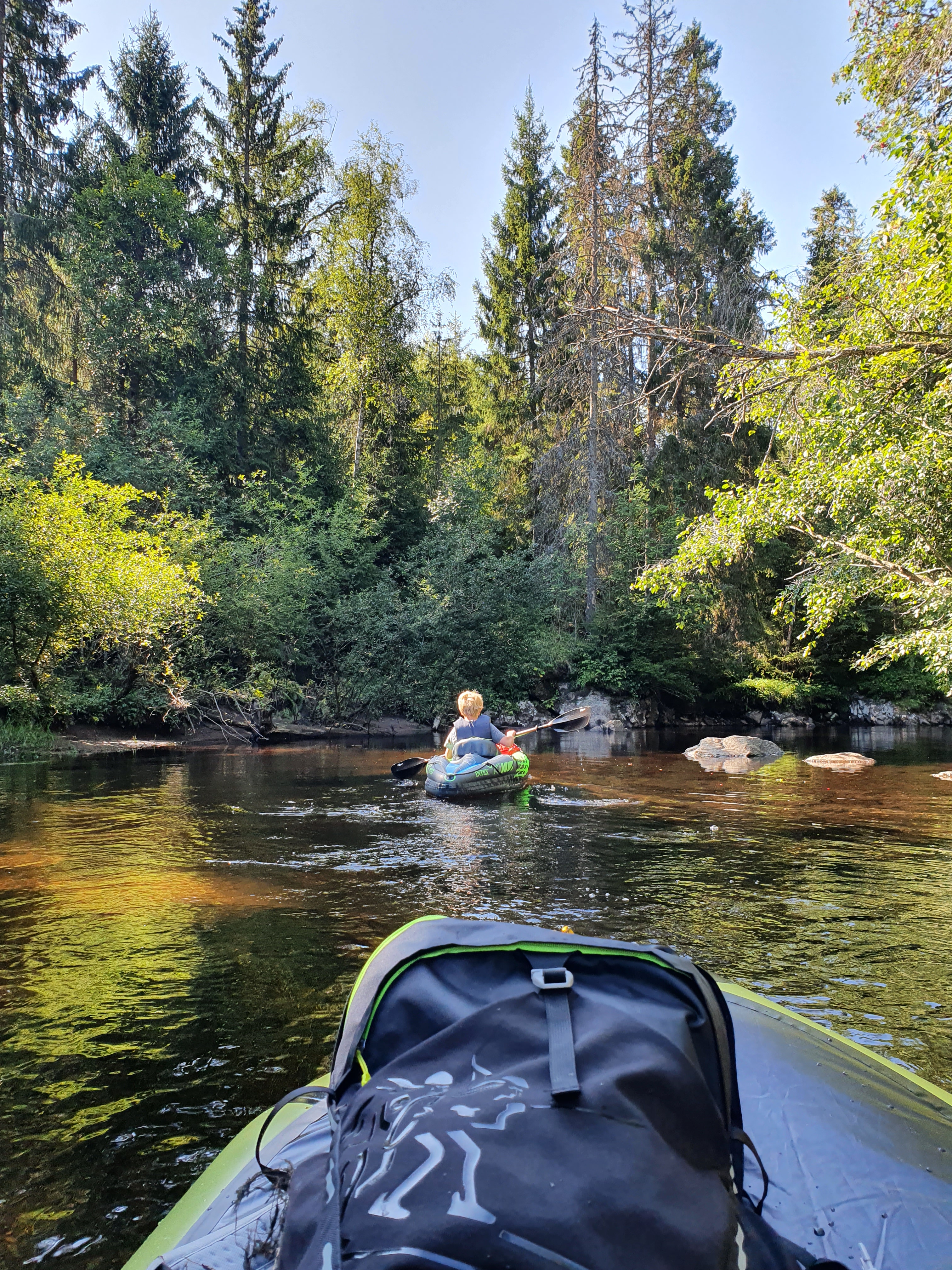 Vi forsøker også å padle Svartoren i Østmarka. Dette er en tur på 6 km t/r et langt smalt vann. 12-åringen padler også her raskere enn jeg gjør i min Packraft. Vi bytter et stykke, og da padler jeg fra han, så da har vi i alle fall funnet ut at det ikke er padleren det kommer an på! Kajakken er retningsstabil, og padler fint selv med en del motvind. Igjen er det fint å ha med litt bagasje og en vannflaske under nettet foran.